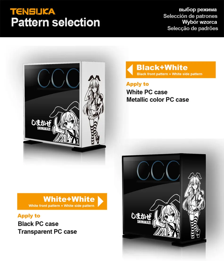 4. Este producto incluye una pegatina con patrón frontal, una pegatina de cristal lateral y una pegatina con texto.Seleccione la pegatina adecuada para el color de la carcasa de su PC según la ilustración.