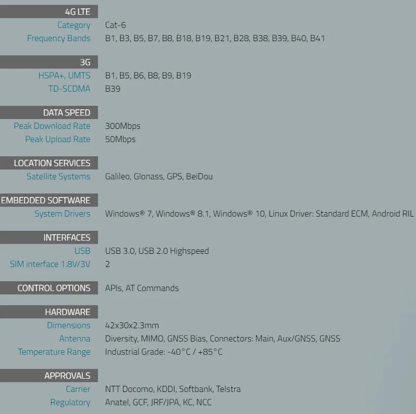 This LTE-Advanced Cat-6 embedded module delivers up to 300 Mbps download speed and supports most 4G LTE bands in the market providing coverage for Asia Pacific on a single SKU. With automatic fallback to 3G networks and integrated GNSS receiver (GPS, GLONASS, Beidou, and Galileo satellite systems supported), the EM7430 is ideal for networking and telematics applications.