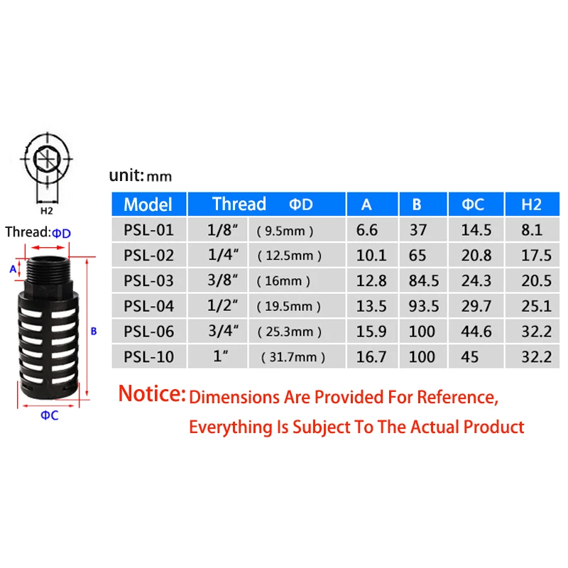 Plastic muffler is great for pneumatic equipments use. With male thread, easy for you to fix and take it off. Attached to pneumatic exhaust port to diminish noise.