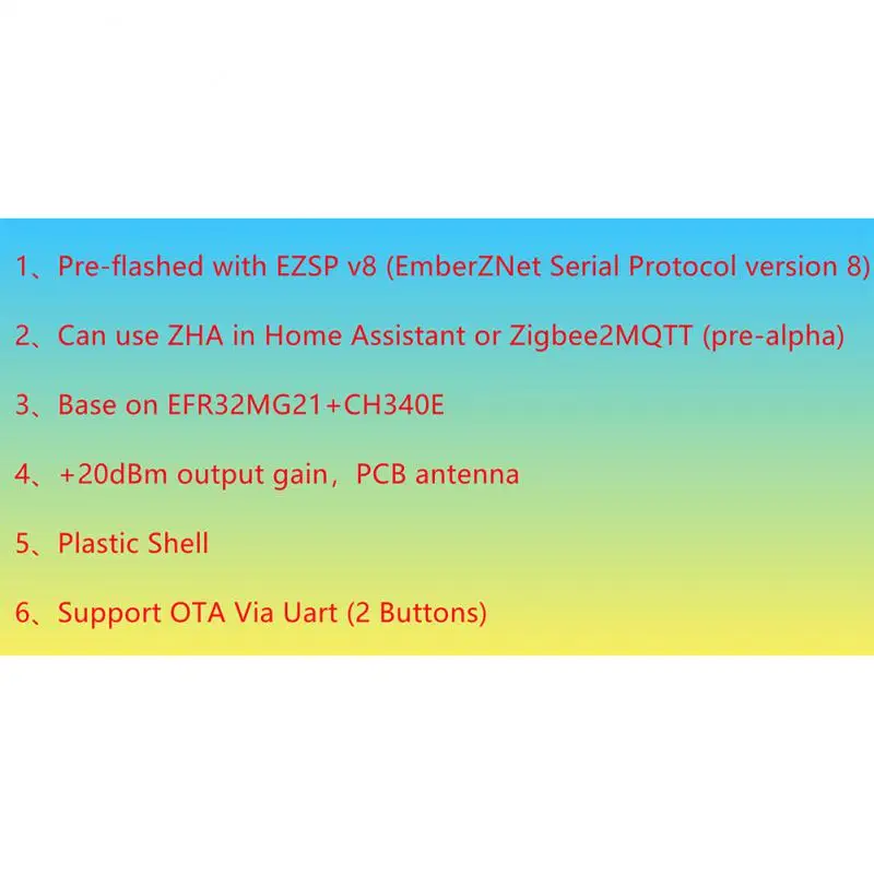 El hardware se basa en Silicon Labs EFR32MG21 Serie 2 SoC inalámbrico Multiprotocolo (número de pieza EFR32MG21A020F768IM32) y controlador de puente USB a serie/UART aWCH CH340E. Aunque solo tiene una antena de placa de circuito PCB, la radio tiene un amplificador de potencia integrado de + 20 dBm (potencia de salida). Y-104,5 dBm Sensibilidad de recepción que debería hacerse para un muy buen coordinador o enrutador Si tanto el hardware como el firmware se implementan correctamente.