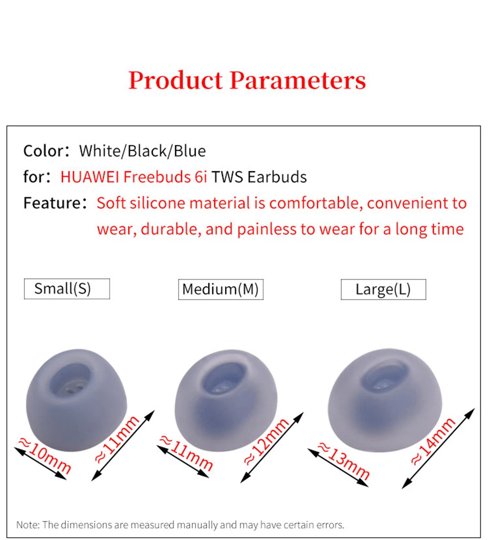 Suit for :HUAWEI Freebuds 6i/HUAWEI Freebuds Pro 1/2/3 earbudsWith dust cover, soft silicone material, soft and comfortable, available in three colorsColor:Black, White, BlueSize : S , M, L