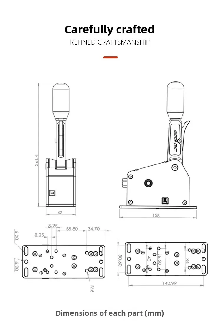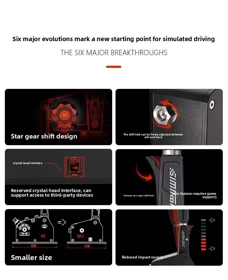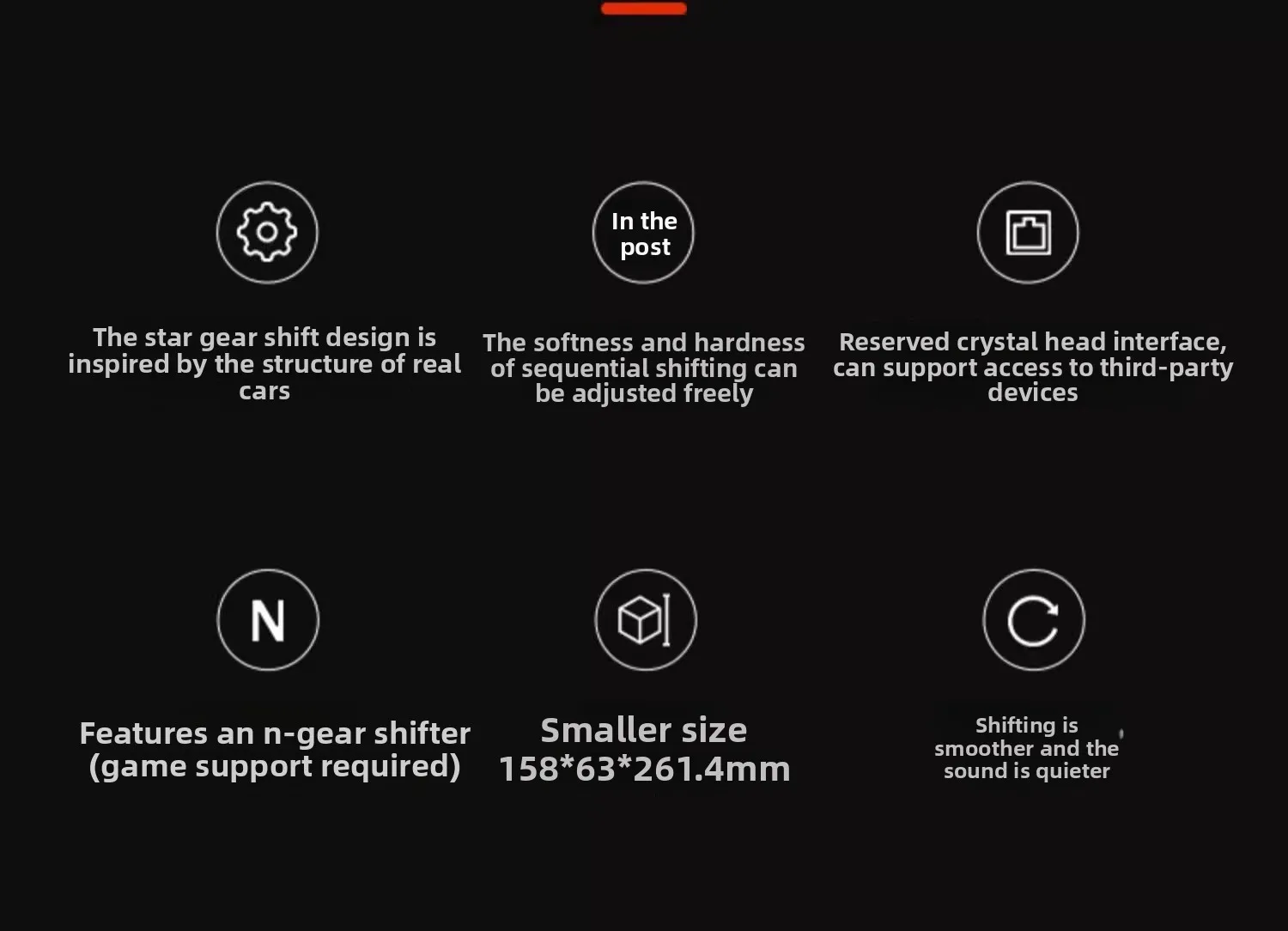 Características:- Diseño de cambio de marchas en estrella, inspirado en la estructura real del automóvil.- El cambio de secuencia, el tacto suave y duro se pueden ajustar libremente- Interfaz de cabeza de cristal reservada, puede admitir acceso a equipos de terceros- Con mango N-gear (esta función requiere soporte para el juego)- Tamaño más pequeño: 158*63*261,4 mm- El engranaje es suave y el sonido es bajo.