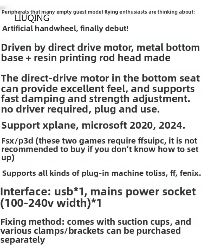 A320/B737 Tiller de dirección Volante Nariz Tiller Versión USB (manestro izquierdo/derecho) para Airbus/h Boeing Xplan 11/12 Última configuración:- Sistema de centrado de motor sin escobillas: garantiza la precisión del centrado incluso con un uso prolongado- Fuerza de centrado y par personalizables: adapte la sensación a sus preferencias- Amortiguación de centrado personalizable: establezca sus propias configuraciones únicas- Se recomienda a los usuarios de PC de escritorio que opten por la versión USB- Sensor Hall de alta precisión sin contacto: la vida útil teórica es ilimitada- Placa de identificación grabada con láser: caracteres más claros para una mejor legibilidad- Las versiones para zurdos y diestros son opcionales- Mango reemplazable: Compatible con el mango B737Métodos de montaje:- Se puede fijar al escritorio mediante adhesivo 3M.- Se puede montar con ventosas (las ventosas están incluidas en el paquete de accesorios).- La distancia entre los orificios de instalación de los tornillos inferiores es de 60 mm * 60 mm.Después de quitar la ventosa, puede utilizar tornillos M4 para montarla en un perfil o bastidor.Configuración de juegos y modelos compatibles:- Para Avión 11/12- Para Microsoft Flight Simulator 2020- Para FBW 320- Para Fnixe320- No se requiere configuración complicada.Similar al juego típico periféricos.Si tiene problemas de configuración, comuníquese con servicio al cliente.Paquete incluido:- 1 x Juego de lanzador de vuelo SimDetalles de empaquetado: