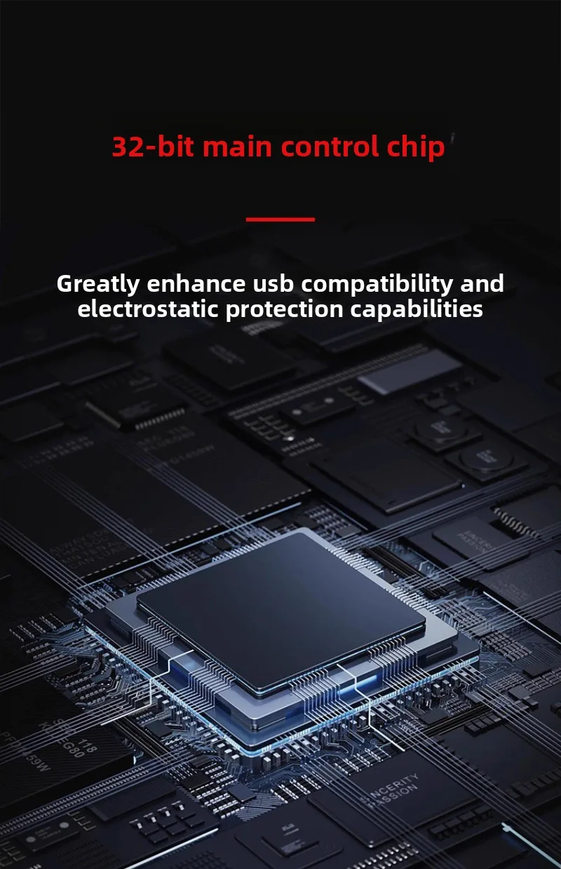 -.El chip de control principal de 32 bits se utiliza para mejorar la compatibilidad con USB y las capacidades de protección ESD.