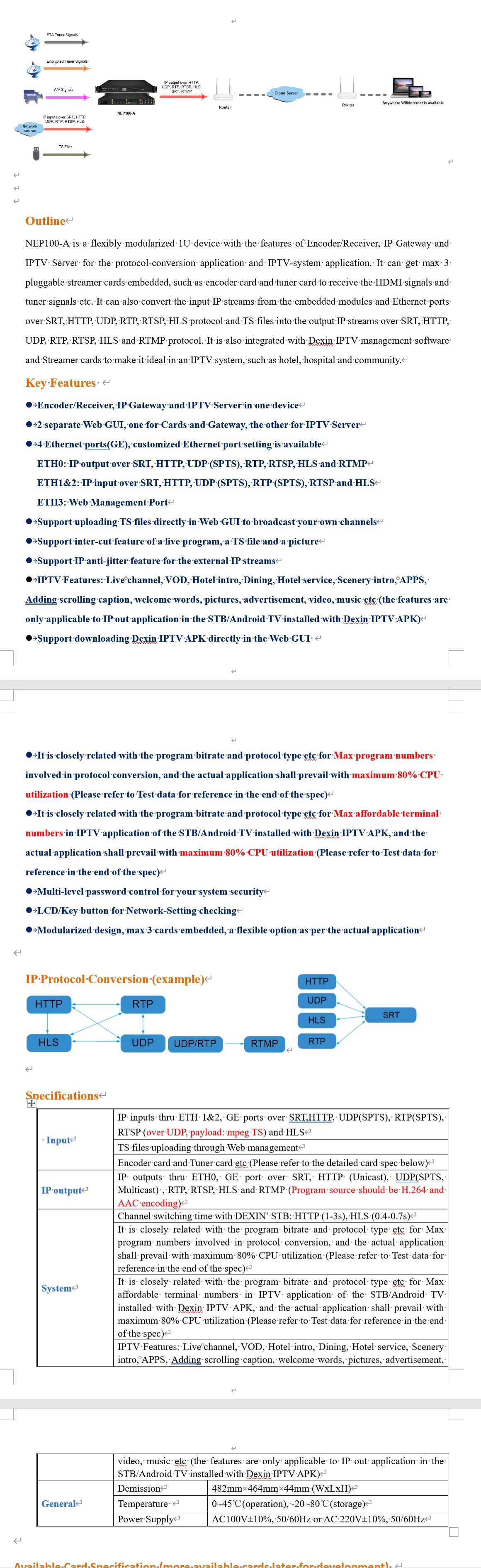 TUNER TO IPTV SERVER es un dispositivo 1U modularizado de manera flexible con las características de codificador/receptor, puerta de enlace IP y servidor IPTV para la aplicación de conversión de protocolo y la aplicación del sistema IPTV.Puede incorporar un máximo de 3 tarjetas serpentinas enchufables, como una tarjeta codificadora y una tarjeta sintonizadora para recibir las señales HDMI y las señales del sintonizador, etc.También puede convertir los transmisores IP de entrada desde módulos integrados y puertos Ethernet a través de protocolos SRT, HTTP, UDP, RTP, RTSP, HLS y archivos TS en transmisores IP de salida a través de SRT, HTTP, UDP, RTP, RTSP, HLS y RTMP.También está integrado con el software de administración de IPTV Dexin y tarjetas Streamer para que sea ideal en un sistema de IPTV, como hoteles, hospitales y comunidades.