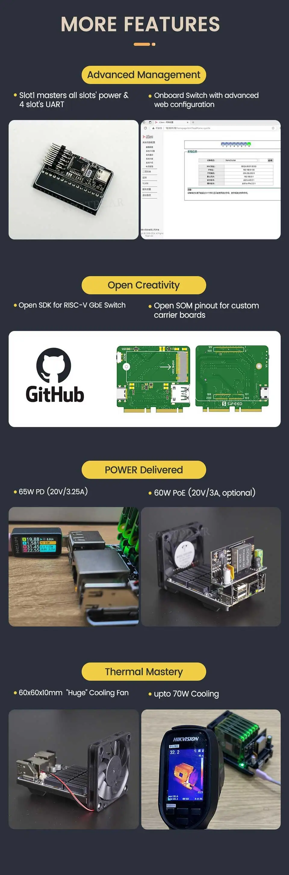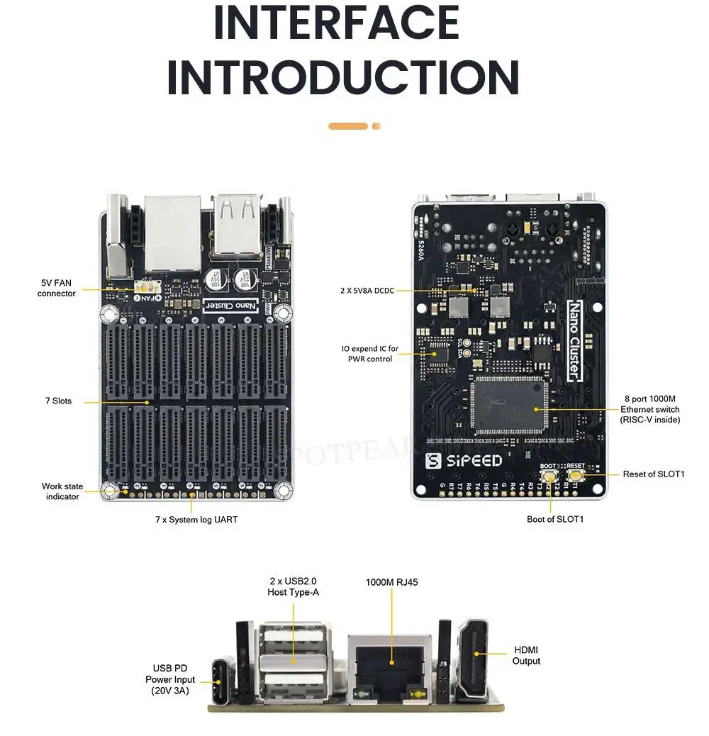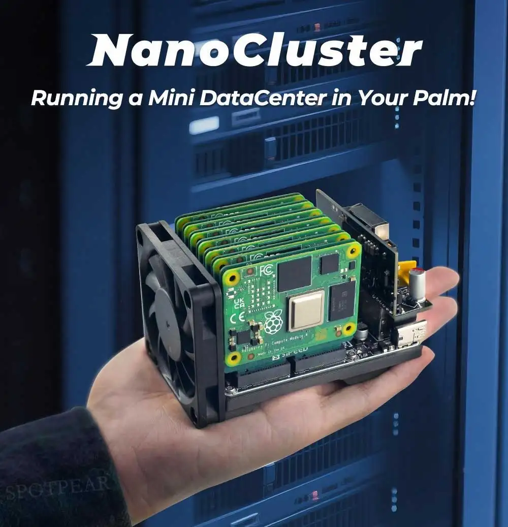 [] NanoCluster es una placa de grupo ultraminiatura desarrollada por Sipeed, que cuenta con 7 ranuras SOM interconectadas a través de un conmutador Gigabit basado en RISC-V.Admite fuente de alimentación USB-C PD y expansión PoE opcional.Además, NanoCluster proporciona UART independiente y control de potencia, lo que la convierte en una plataforma básica ideal para usuarios de HomeLab que exploran informática distribuida, Kubernetes, Docker y computación de borde.