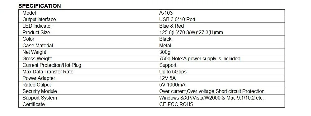 Característica1. Hub USB de 10 puertos de grado industrial, calidad de material totalmente metálico, admite conexión de dispositivos de 10 piezas al mismo tiempo.2. Admite velocidad de transferencia de sincronización de datos USB 3.0 de hasta 5 Gbps. Conecte dispositivos USB como almacenamiento externo, teléfono, tabletas, cámaras digitales, impresoras y más dispositivos industriales.3. Adaptador de corriente externo 12V5A, la salida de cada puerto alcanza 5V 1A, carga para teléfono móvil, iPad, etc. Compatible con el acuerdo BC1.2. Es con el soporte de montaje que se puede instalar en el escritorio y en la pared.4. Está hecho de una carcasa de aleación de aluminio, rápida disipación del calor y resistencia a altas temperaturas.Con soporte de montaje, se puede instalar en la pared o escritorio, con luces indicadoras LED, protección contra sobrecorriente, sobretensión, protección contra cortocircuitos, aprobación CE, FCC, ROHS.