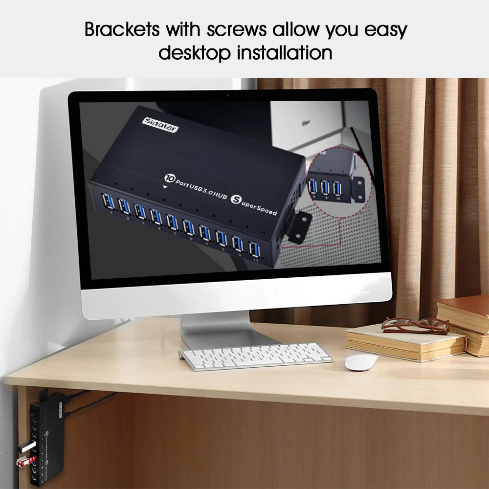 Característica1. Hub USB de 10 puertos de grado industrial, calidad de material totalmente metálico, admite conexión de dispositivos de 10 piezas al mismo tiempo.2. Admite velocidad de transferencia de sincronización de datos USB 3.0 de hasta 5 Gbps. Conecte dispositivos USB como almacenamiento externo, teléfono, tabletas, cámaras digitales, impresoras y más dispositivos industriales.3. Adaptador de corriente externo 12V5A, la salida de cada puerto alcanza 5V 1A, carga para teléfono móvil, iPad, etc. Compatible con el acuerdo BC1.2. Es con el soporte de montaje que se puede instalar en el escritorio y en la pared.4. Está hecho de una carcasa de aleación de aluminio, rápida disipación del calor y resistencia a altas temperaturas.Con soporte de montaje, se puede instalar en la pared o escritorio, con luces indicadoras LED, protección contra sobrecorriente, sobretensión, protección contra cortocircuitos, aprobación CE, FCC, ROHS.