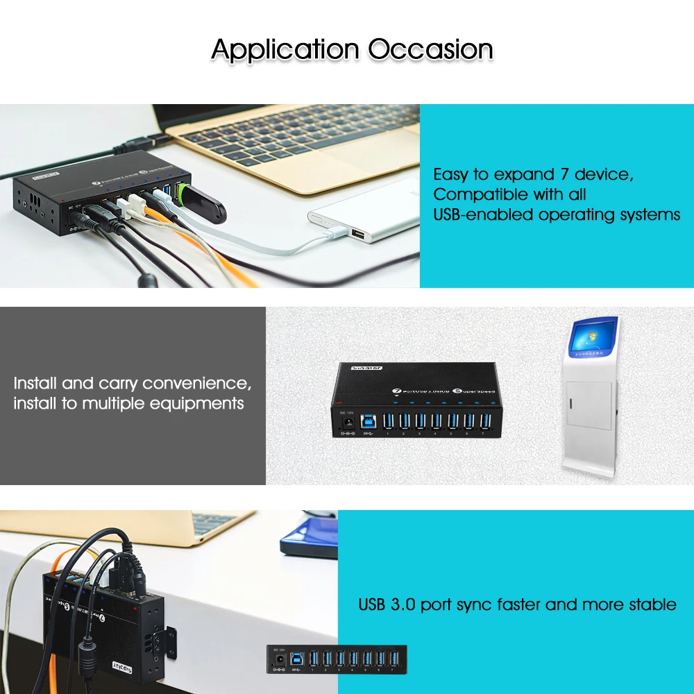 1. Hub USB de 7 puertos de grado industrial A-173, admite conexión de dispositivos de 7 piezas al mismo tiempo.2. Admite velocidad de transferencia de sincronización de datos USB3.0 de hasta 5 Gbps. Conecte dispositivos USB como almacenamiento externo, cámaras digitales, impresoras y más dispositivos industriales.3. Adaptador de corriente externo 12V3A, la salida de cada puerto alcanza 5V 1A, carga para almohadilla de teléfono móvil, etc. Compatible con el acuerdo BC1.2. Es con el soporte de montaje que se puede instalar en el escritorio y en la pared.4. Está hecho de una carcasa de aleación de aluminio, con soporte de montaje, rápida disipación de calor y resistencia a altas temperaturas, protección contra sobrecorriente, sobretensión, protección contra cortocircuitos, aprobación CE, FCC, ROHS.5. Puede funcionar para la reparación y restauración del teléfono, whatsapp, facebook wechat Twitter, control de grupo para marketing.Contenido del paquete:1,7 puertos 3.0 HUB USB *1Cable USB 3.0 de 2,1 M * 1Adaptador de corriente de 3,12 V 3 A * 14. Cable de alimentación * 15.Manual de usuario*1