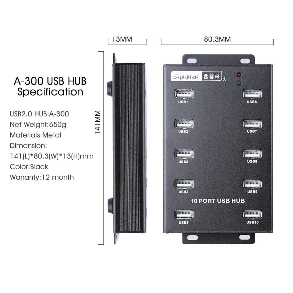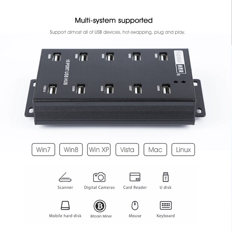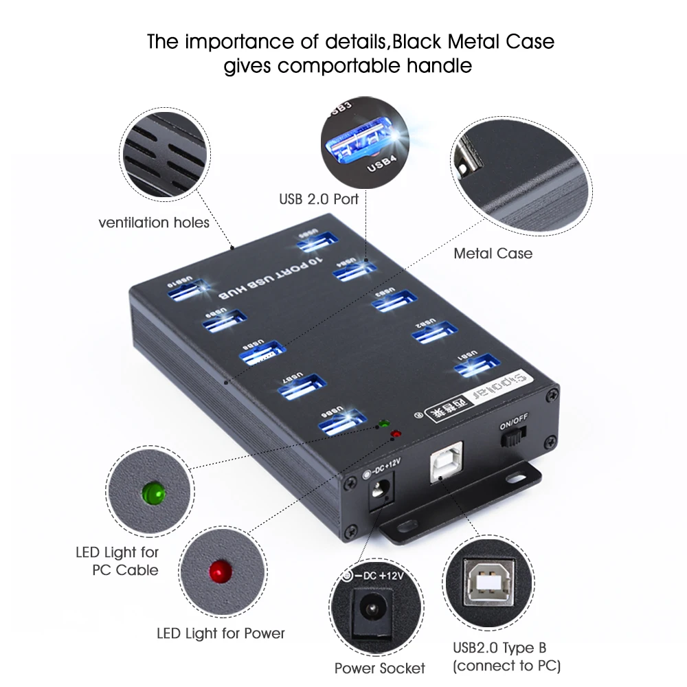 1. Concentrador USB 2.0 de 10 puertos de grado industrial A-300, admite conexión de dispositivos de 10 piezas al mismo tiempo, conecta el disco duro móvil, el flash del teléfono móvil, la expansión del puerto USB. Velocidad de transferencia de sincronización de datos de hasta 480Mbps.2. Uso para flash de teléfono móvil, facobook, Twitter, WhatsApp, wechat,SNS para marketing, control de grupo con el software de tercera parte.2. Adaptador de corriente externo 12V5A, la salida de cada puerto alcanza los 5V 600MA (debe conectarlo al PC para cargarlo), compatible con Win7, Windows Vista, Windows XP Pro/home edition, windows 98/ME/2000 Pro/home edition,MACOS 9,0 y otros.3. Está hecho de carcasa de aleación de aluminio, con luces indicadoras LED, interruptor de encendido/apagado, protección contra sobrecorriente, sobretensión, protección contra cortocircuitos, aprobación CE, FCC, ROHS.4. Puede funcionar para la reparación y reacondicionamiento de teléfonos. Y para mineros de criptomonedas Bitcoin.Contenido del paquete1,10 puertos USB HUB * 12. Cable USB 2,0*1Adaptador de corriente 3,12 V 5A * 14. Cable de alimentación * 15. Manual de usuario * 1