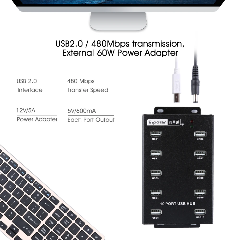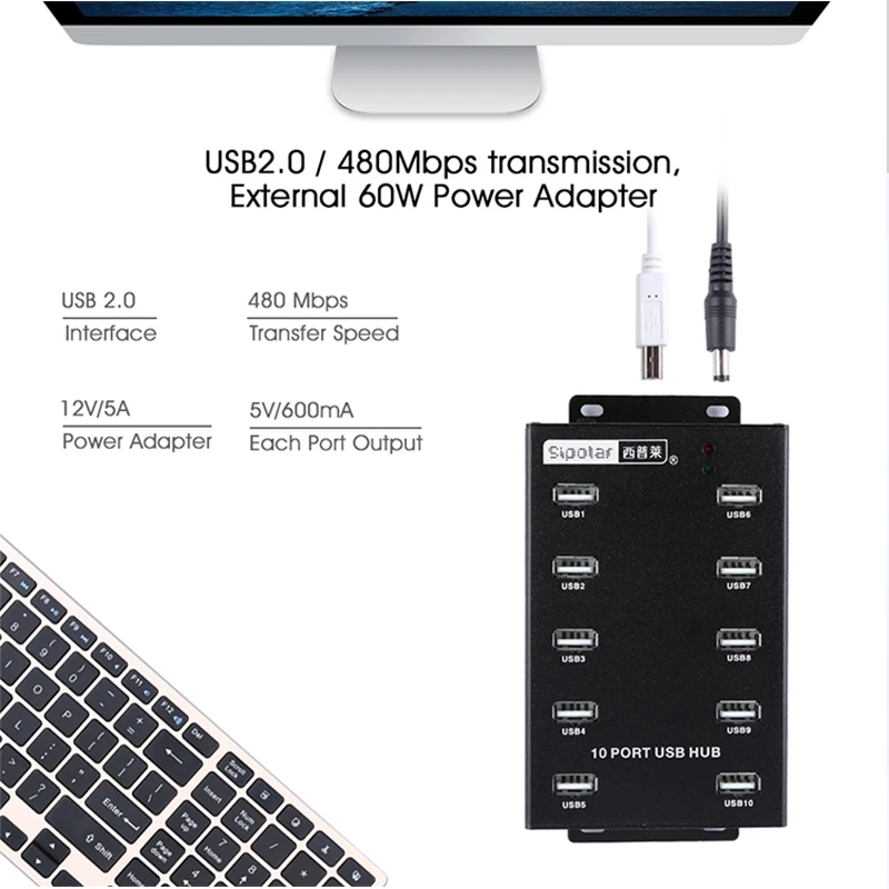 Comprar Sipolar-Adaptador USB 2,0 de alta velocidad, Cable de extensión Plug and Play para PC, portátil, teléfono, tabletas, SSD, HDD, 10 puertos, 60W