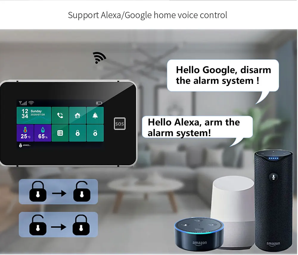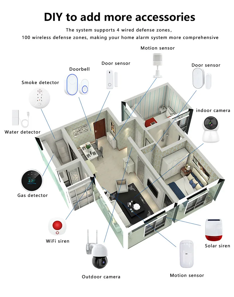 Integra una variedad de tecnologías de comunicación actualmente más avanzadas.Tarjeta RFID + APP + WiFi + Tarjeta SIM, Todas las funciones en un solo sistema.Esta no es solo una alarma antirrobo doméstica, sino también un centro de control doméstico inteligente.