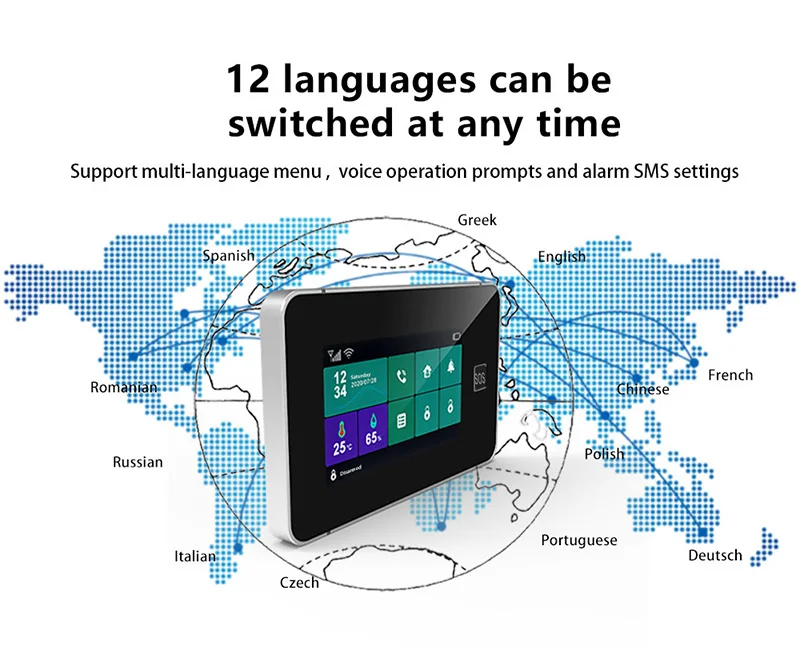 Este sistema de alarma admite 12 idiomas para cambiar: inglés, ruso, español, alemán, polaco, chino, italiano, francés, portugués, griego, rumano y checo.