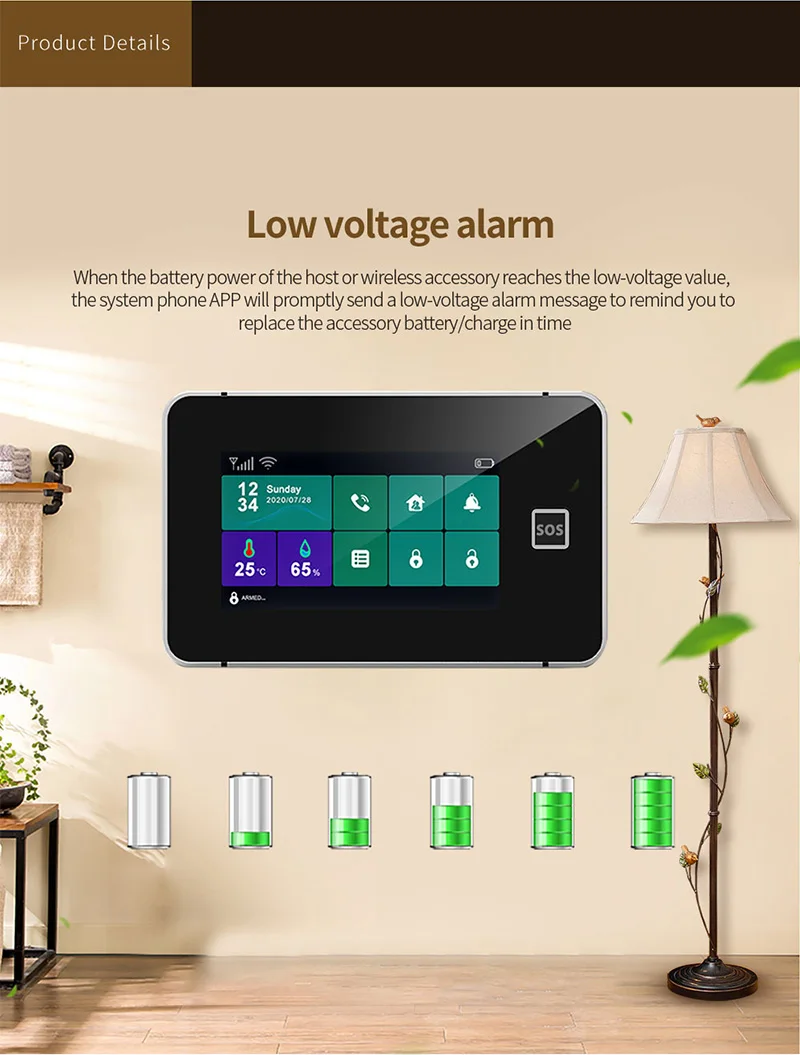 Cuando el voltaje del sistema de alarma es insuficiente.Puede recibir recordatorios de bajo voltaje a tiempo.Y cargue el sistema de alarma a tiempo.