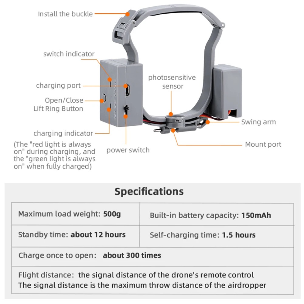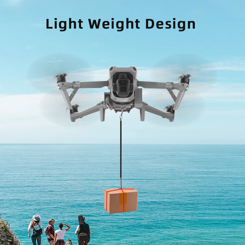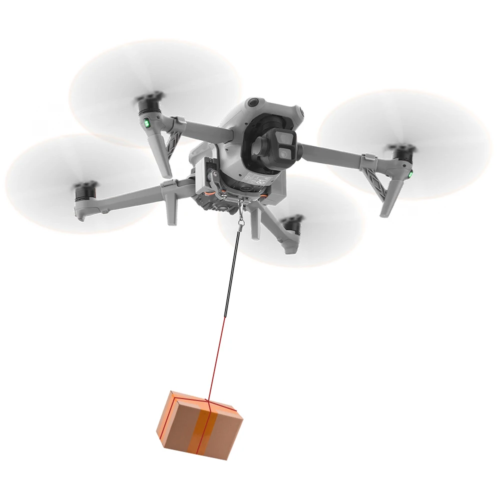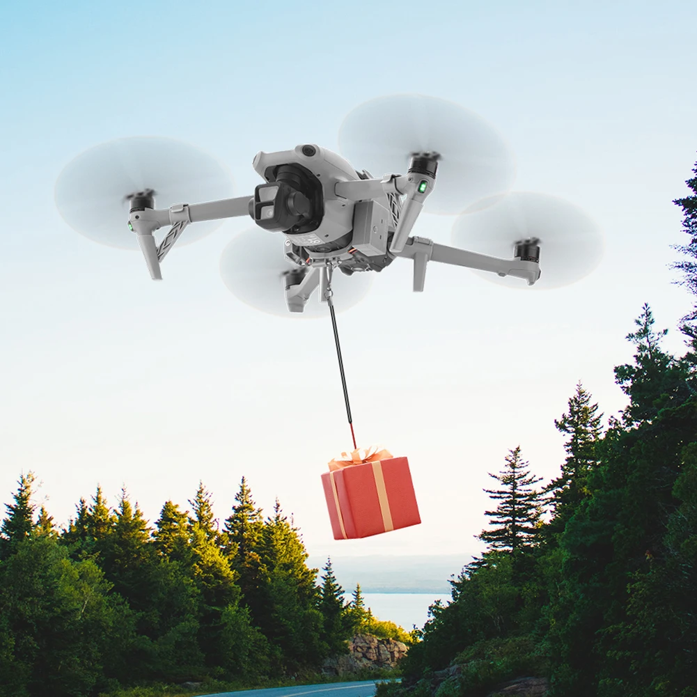 1. Compatible con el Dron Air 3:Diseñado específicamente para el Dron Air 3, este sistema de caída de aire permite la entrega remota de varios artículos. Ya sea para fines publicitarios, cebo de peces, regalos, entrega de comida o incluso anillos de compromiso, este sistema ofrece versatilidad y comodidad.