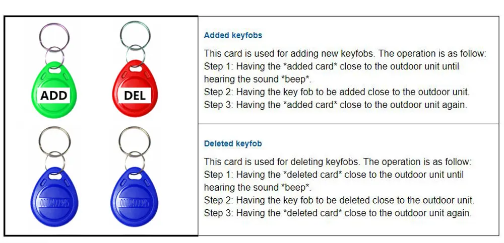 Hay varias formas de abrir la cerradura de la puerta cuando está fuera de la puerta: usando los llaveros RFID o el conjunto de control remoto. Este artículo viene con 10 llaveros RFID (incluye llavero añadido y llavero eliminado). Además, si necesita más llaveros RFID, puede agregar la cantidad de llavero RFID que desee.