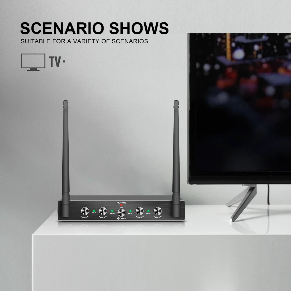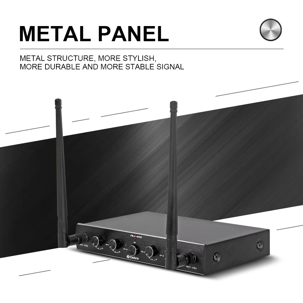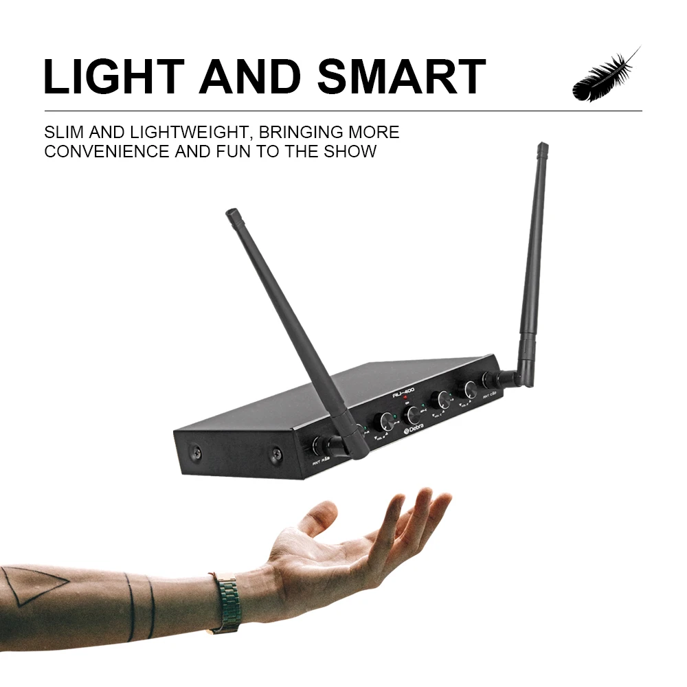 El sistema Debra Audio AU400 es el sistema de micrófono inalámbrico de frecuencia fija UHF de 4 canales que proporciona amplios rangos de cobertura de área con una fácil configuración y un funcionamiento sin interferencias.La transmisión UHF inalámbrica permite un rendimiento vocal dinámico, manos libres y nítido para salas de conferencias, aulas, salas de baile, salas de KTV, iglesias, fiestas y bandas.El receptor inalámbrico VHF de construcción metálica cuenta con controles de volumen de canal ajustables individuales junto con indicadores de señal de audio.
