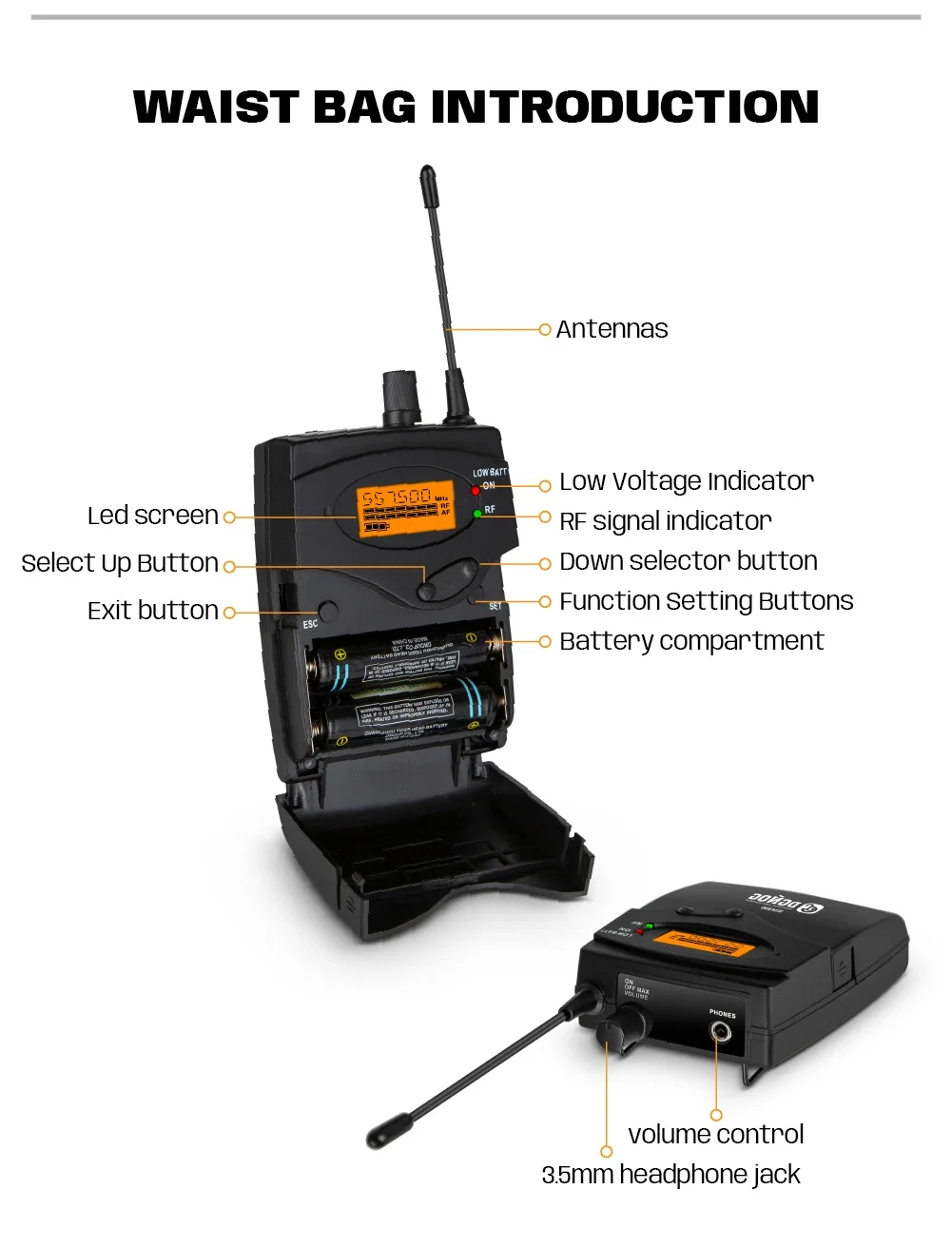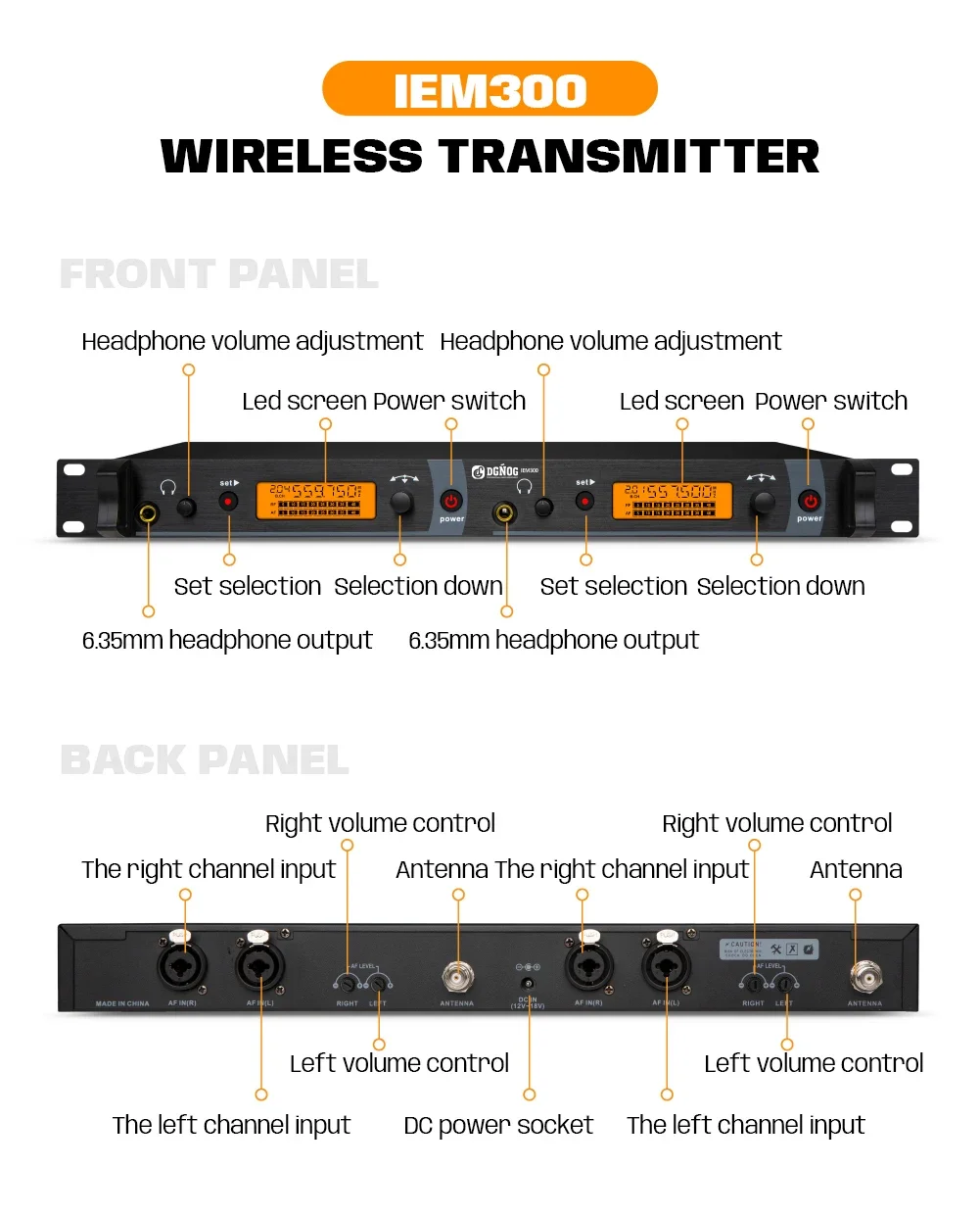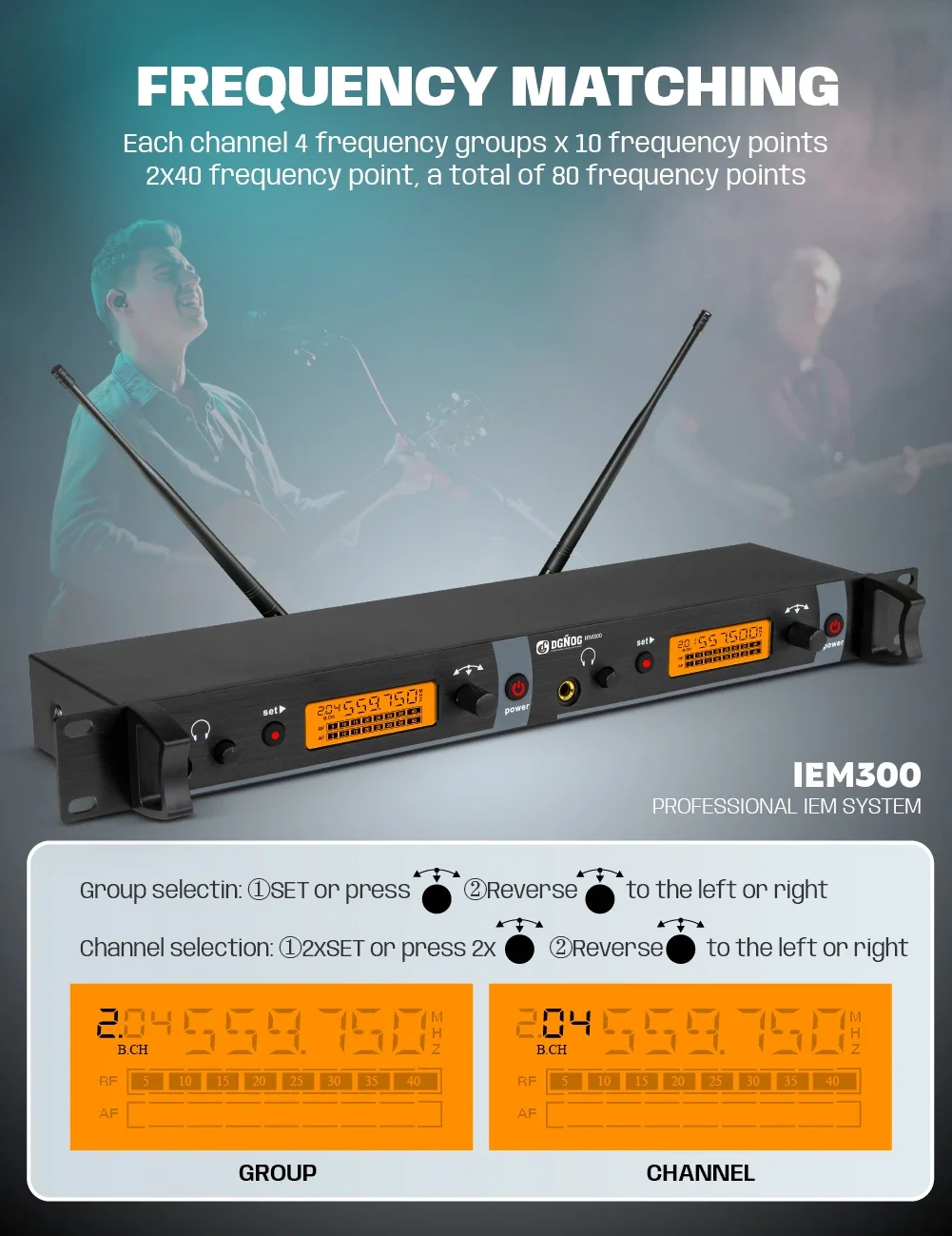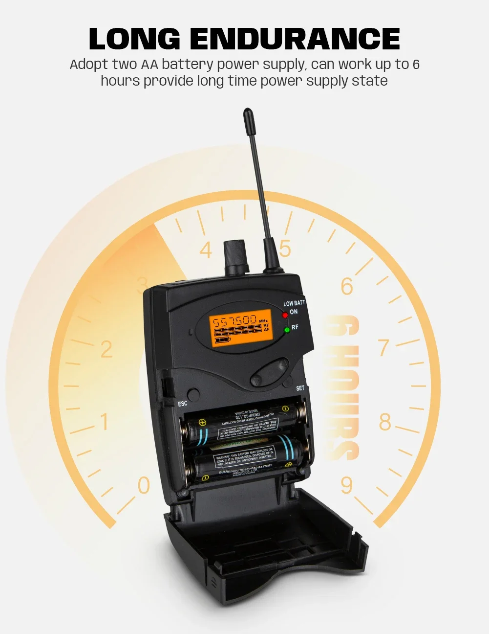 【Sistema de monitor interno inalámbrico UHF de metal completo】- Nuestra tecnología PLL de bloqueo de fase de banda UHF ofrece un rendimiento excepcional dentro de un ancho de banda de 32 MHz, proporcionando 40 frecuencias preestablecidas para una conmutación perfecta.Cada canal cuenta con 4 bandas de frecuencia con 10 puntos de frecuencia ajustables.