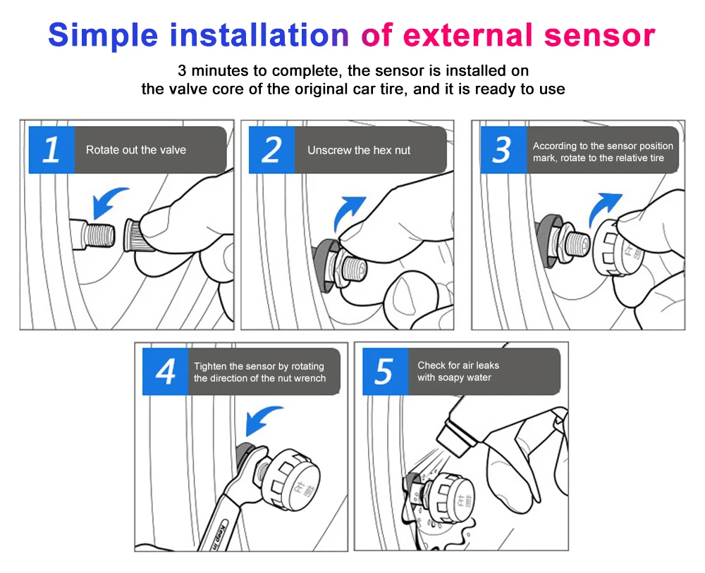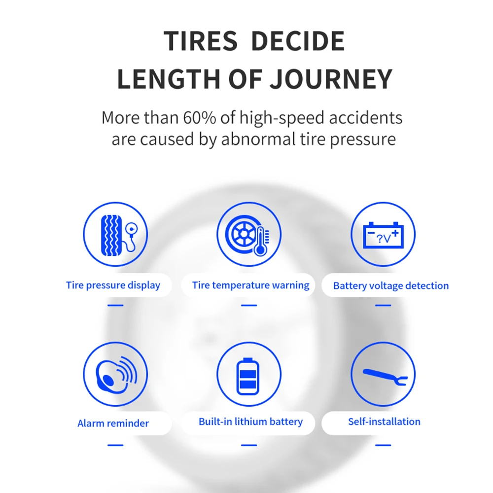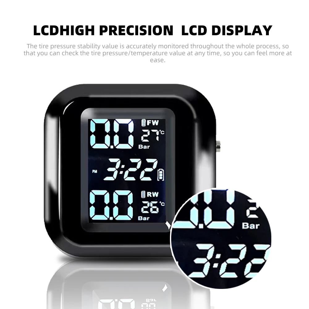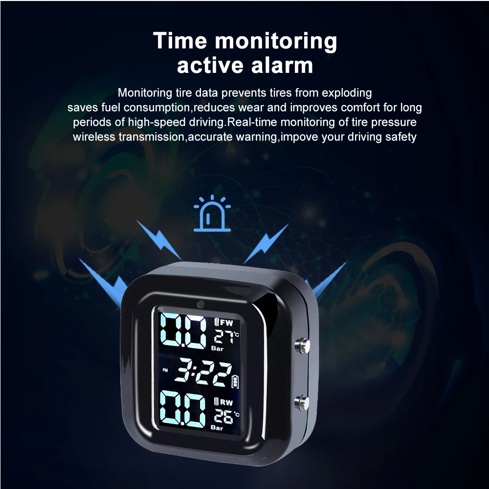 La función principal: 1. La presión y la temperatura de los neumáticos se muestran al mismo tiempo 2. Alarma por presión y temperatura anormal de los neumáticos, Alarma cuando la presión de los neumáticos es superior a 3,2 bar (valor predeterminado) Alarma cuando la presión de los neumáticos es inferior a 1,8 bar (valor predeterminado) Alarma cuando la temperatura del neumático es superior a 68 °C (valor predeterminado) El Valor predeterminado se puede ajustar según las necesidades reales. 3. 4 métodos de alarma: Alarma de alta/baja presión, alarma de alta temperatura y alarma de sensor de baja presión. 5. Voltaje de funcionamiento: DC 5V 6. Unidad de presión: bar/PSI 7. Unidad de temperatura: ℃ / ℉ 8. Temperatura de trabajo:-20-85 ℃ 9. Temperatura de almacenamiento: -40 - 105 ℃ 10. Nivel impermeable: IP67