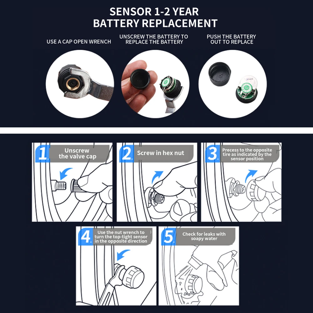 Parámetros del sensor externo. Frecuencia de transmisión: 433,92 MHz Rango de presión: 0-3.5 bar/0-3.5 bar Valor de alarma de baja presión predeterminado: 1,8 bar Valor de alarma de alta presión predeterminado: 3,2 bar Precisión de la presión: ± 0,1 bar / ± 1bar Voltaje de funcionamiento: DC + 2,0-3,6 V Nivel impermeable: IP67 Batería: Batería de botón CR1632 incorporada (la batería puede ser removida y reemplazada por usted mismo) Duración de la batería: 1,5-2 años de valor típico.