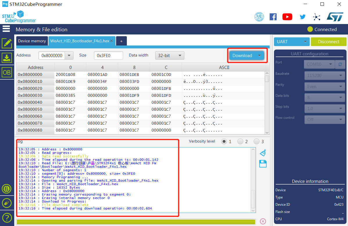 Conecte el cable USB al puerto de La MCU, conecte el puerto serie a PA9 y PA10 y descargue el software recomendado STM32CubeProg y la herramienta de descarga WeAct Studio.