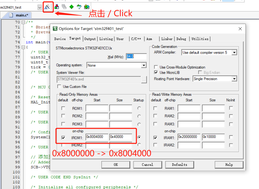 Modifica la dirección de inicio de la ROM del proyecto a 0x8004000.