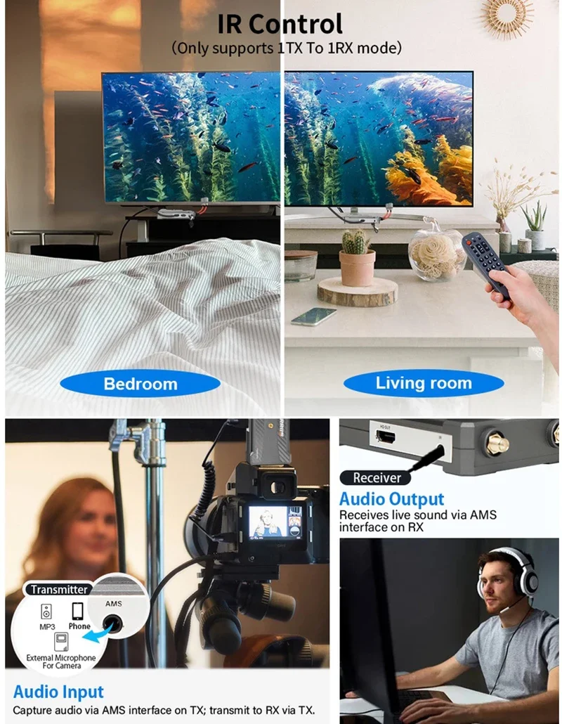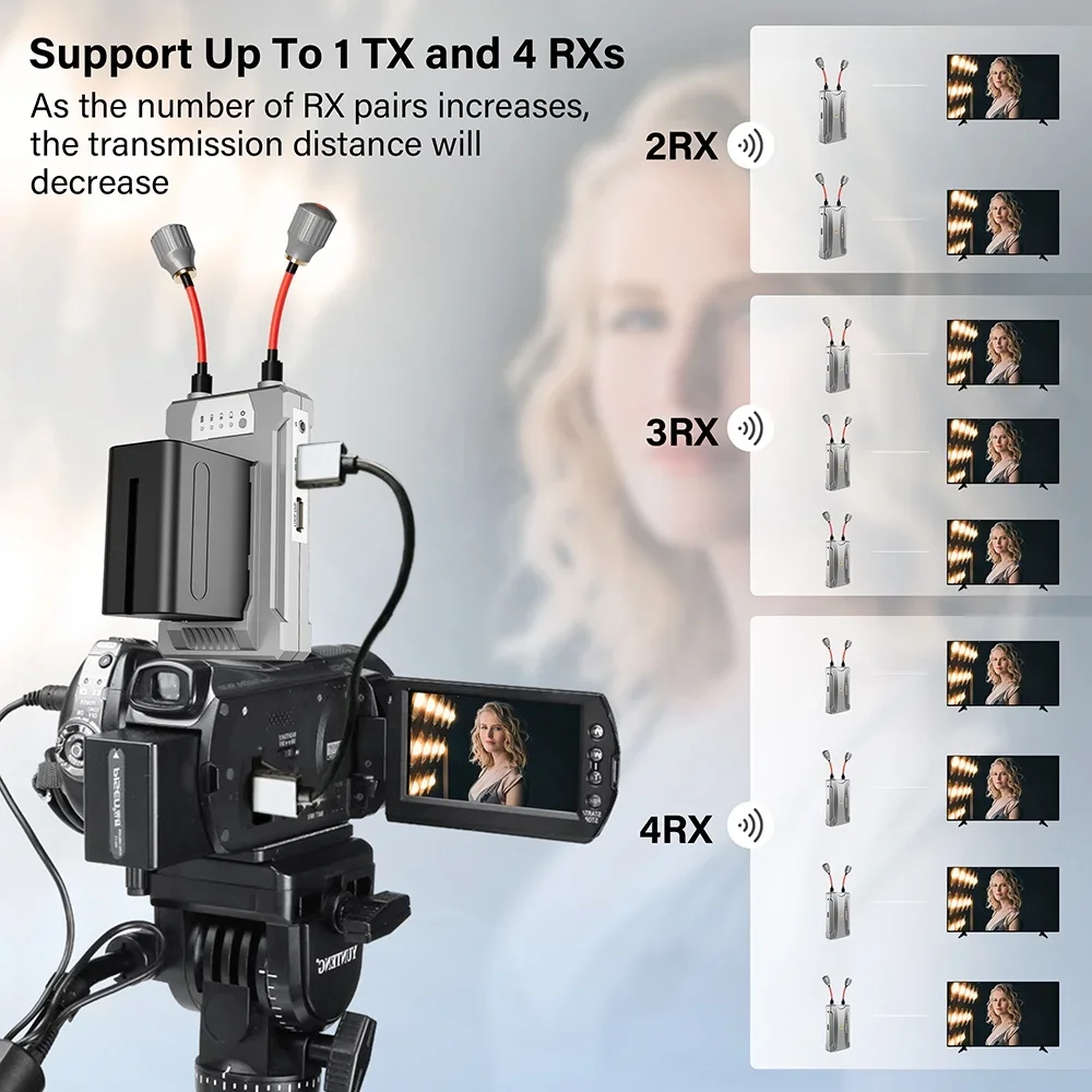 -Rango de transmisión: rango de transmisión de 300m entre 1 TX y 1 RX en un espacio sin barreras.