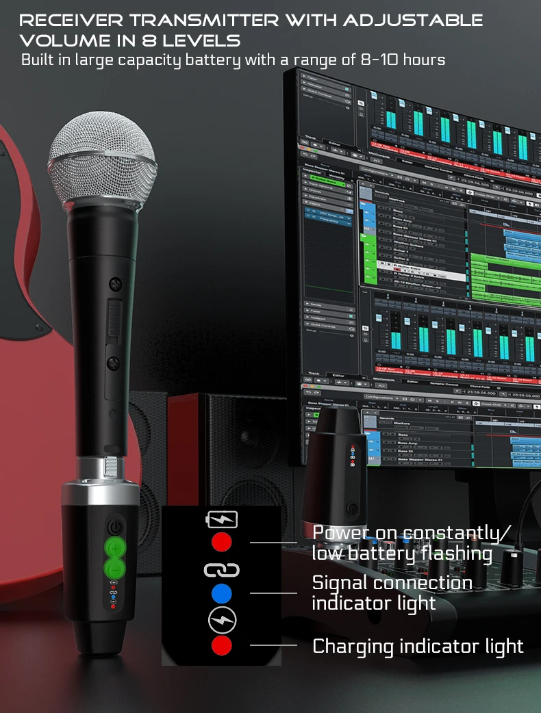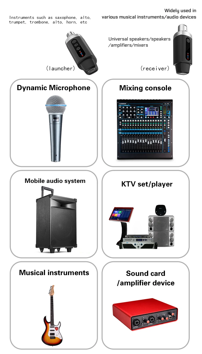 Adecuado para varios micrófonos con cable, instrumentos musicales, consolas de mezclas, KTV y equipos amplificadores, pero no incluye micrófonos de condensador de 48 V.