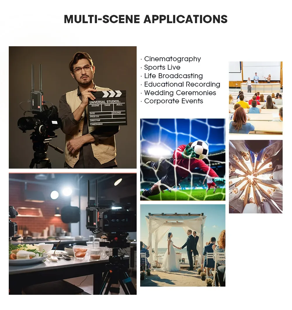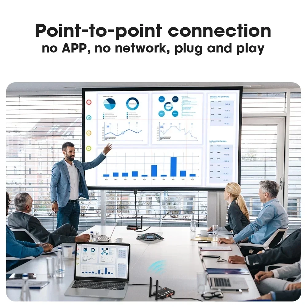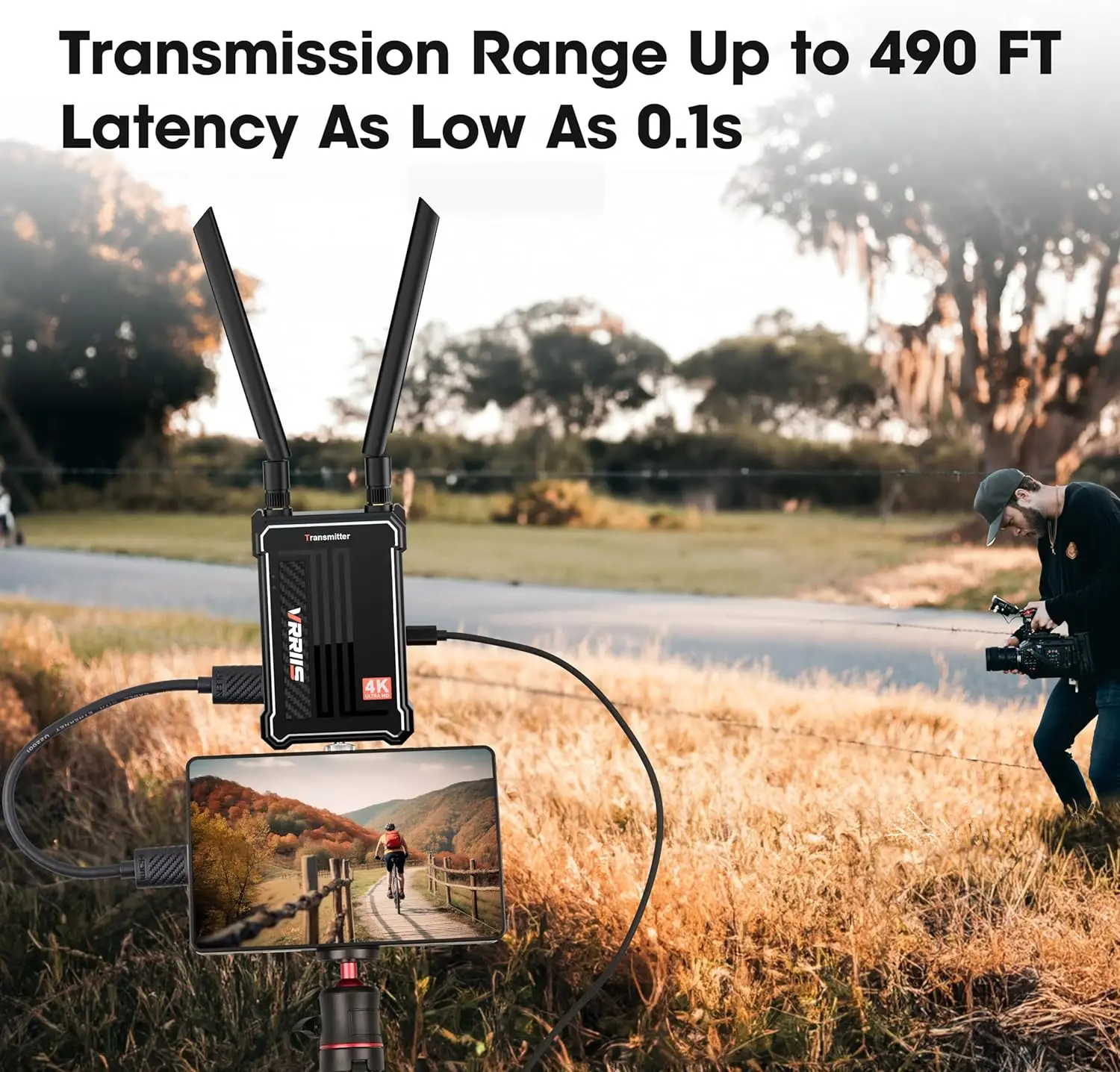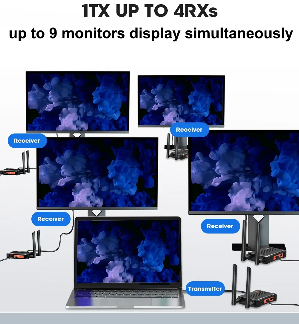 Hasta 490 pies de largo alcance, con una latencia de solo 0,1 S.Soporte 1TX a 4RXs: Soporta 1 transmisor que funciona con 4 receptores,Hasta 9 monitoresMostrar simultáneamente.Plug and Play:No necesita configuración/APP / WiFi o red, Después de emparejar y comenzar a usar.Alta compatibilidad:Aplicable a múltiples escenarios:Nota: