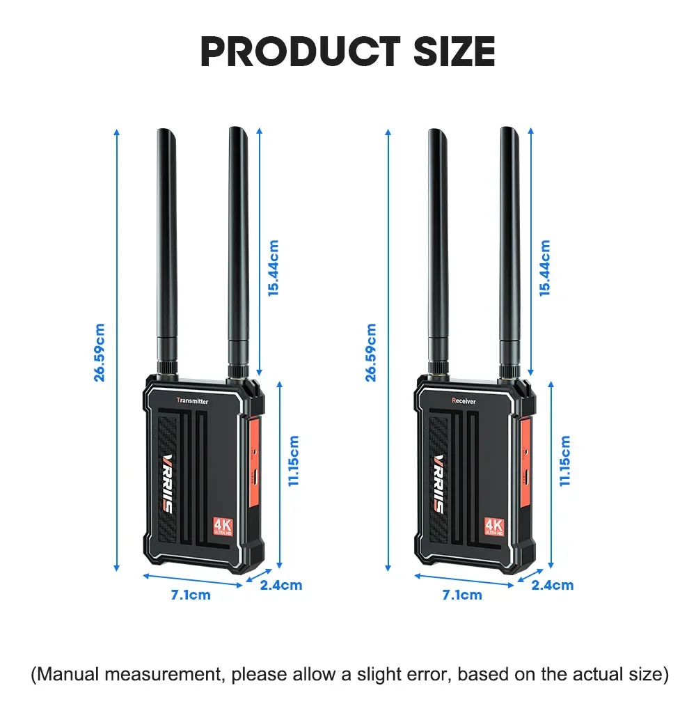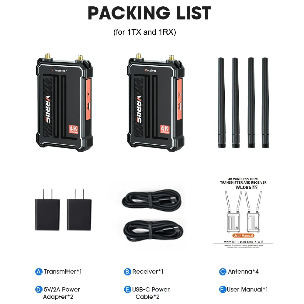 El receptor: 2 puertos de salida HDMI. Puede conectar dos pantallas al mismo tiempo en el receptor, para que el Director/productor/cineasta vea el rodaje en el set.Calidad de imagen 4K UHD: El sistema de transmisión de vídeo inalámbrico WL095 está equipado con tecnología de codificación H.265, combinada con tecnología de hardware, admite Resolución de entrada/salida de vídeo de hasta 4K @ 30Hz.