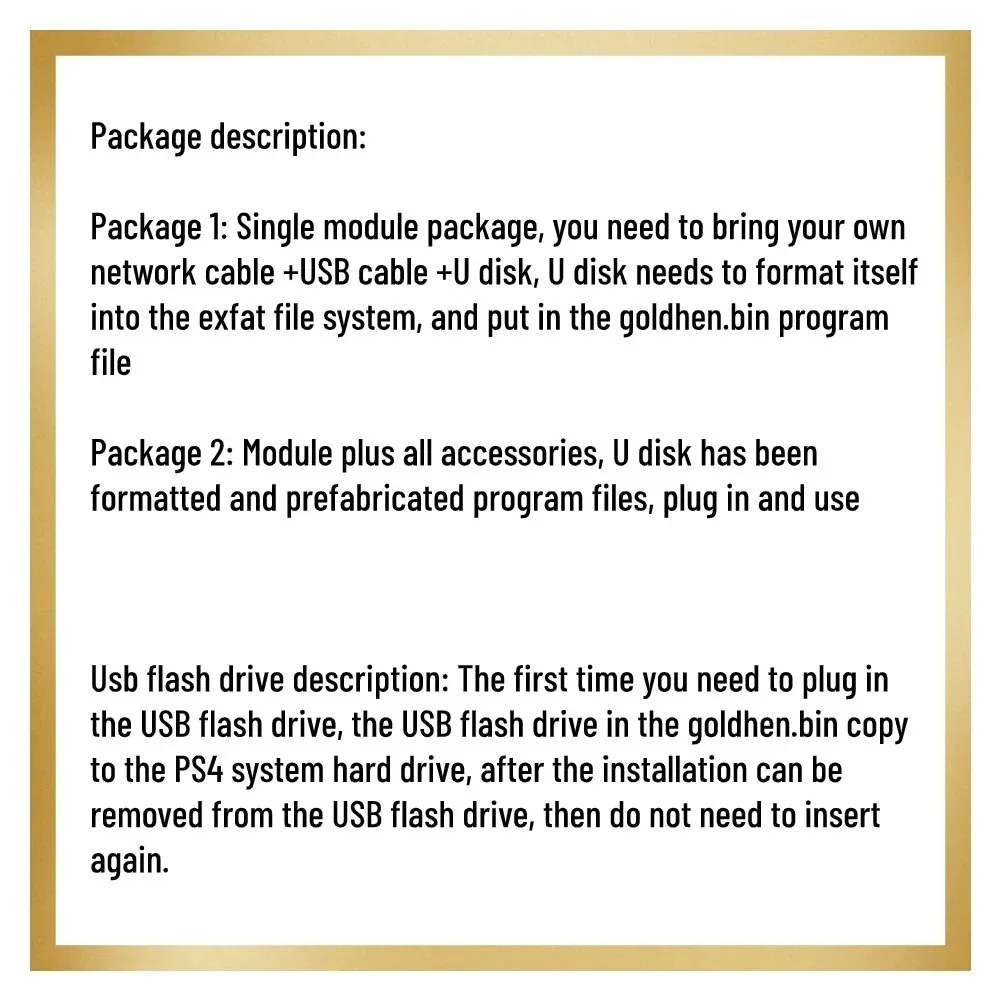 Nuevo y de alta calidad Tipo: adaptador USB JB Material: plástico + metal Color: negro Tamaño: 13*10*5cm (5,12*3,94*1.97in) El paquete incluye: 1 * Compatible con el kit de modificación PS4 11,0. Características: 1. Compatible con el sistema PS4 11,0, sin necesidad de un ordenador, operación simple de usar. 2. Aceleración de consola PS4 fácil de lograr y juego de alta definición sin necesidad de desmontarlo 3. Descarga gratuita de juegos y actualizaciones para evitar bloqueos de cuenta debido a modificaciones 4. Módulo multifuncional de caja de lanzamiento, compatible con múltiples juegos y software. 5. Fácil de operar, enchufar y usar, sin necesidad de conocimientos profesionales o configuraciones complejas. Consejos: 1. Debido al efecto de la luz y los monitores, los colores pueden tener ligeras diferencias. 2. Permita pequeños errores de tamaño debido a la medición manual. ¡Gracias por su comprensión!