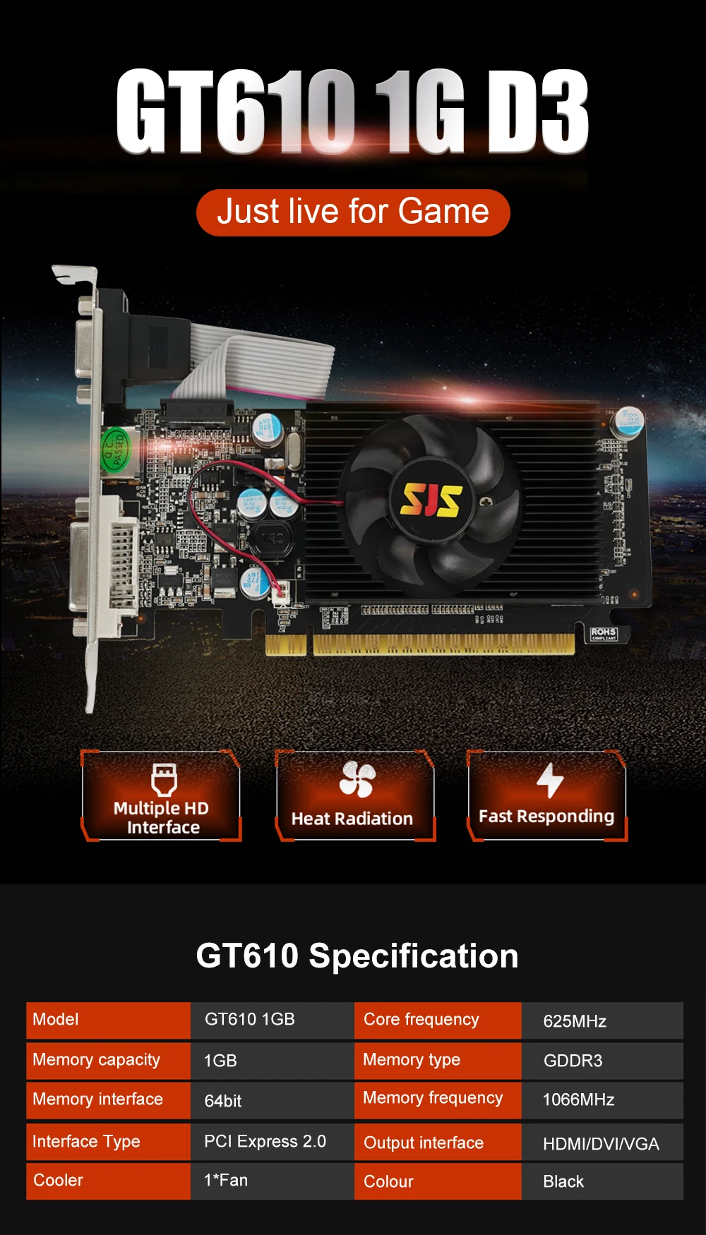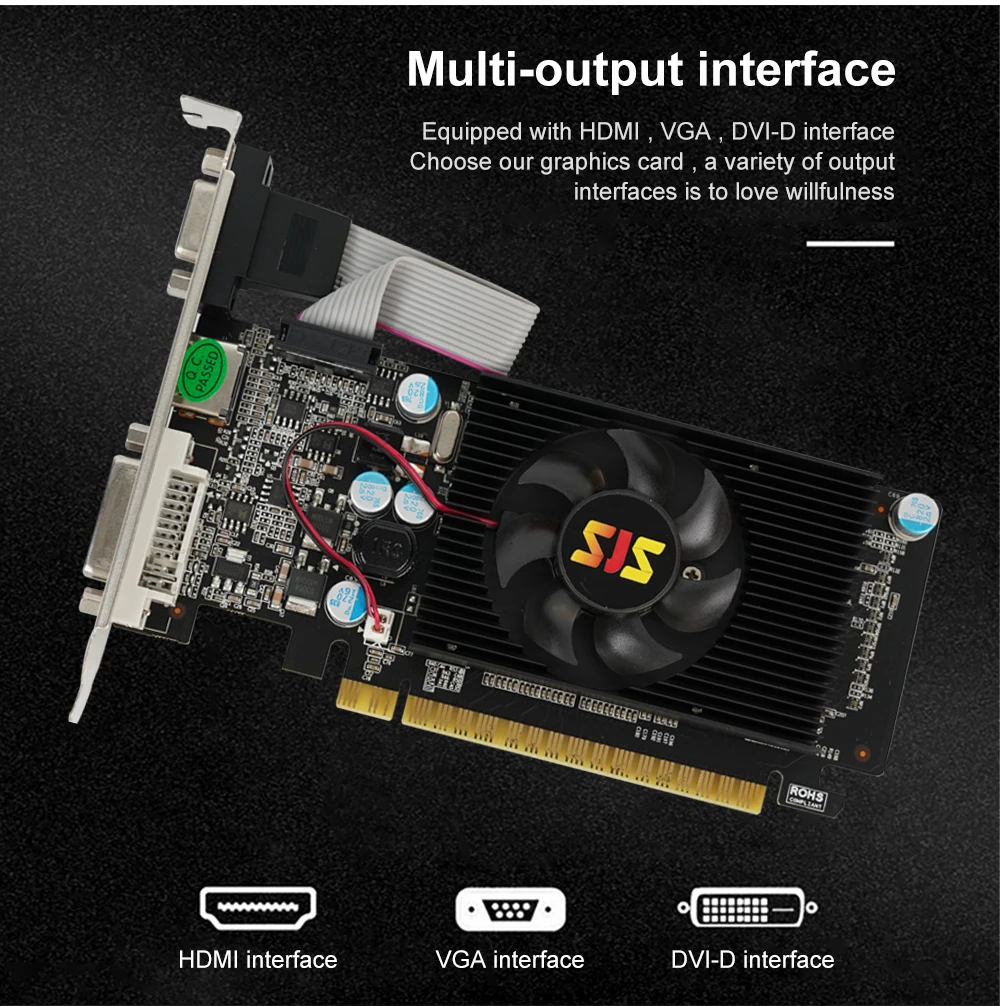 Tarjeta de vídeo SJS GeForce GT610 pantalla Vga tarjetas 1GB DDR3 64Bit tarjetas gráficas para NVIDIA juego PC GT 610 1GD3 HDMI DVI VGA PCI-E2