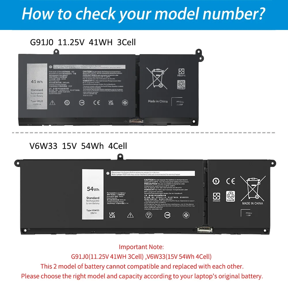 Especificaciones de la bateríaModelo de batería: G91J0 11,25 V/41 WhModelo de batería: V6W33 15V/54WhTipo de batería: Li-PolímeroCondición: 100% nuevo (1 año de garantía)Nota:1.Las computadoras portátiles Dell Inspiron serie 15 tienen 2 baterías diferentes.Seleccione la batería correcta según el modelo de batería original G91J0 o V6W33.2.Nuestras baterías no incluyen cables de conexión de batería. El cable de conexión debe retirarse de la batería original e instalarse en la batería nueva.