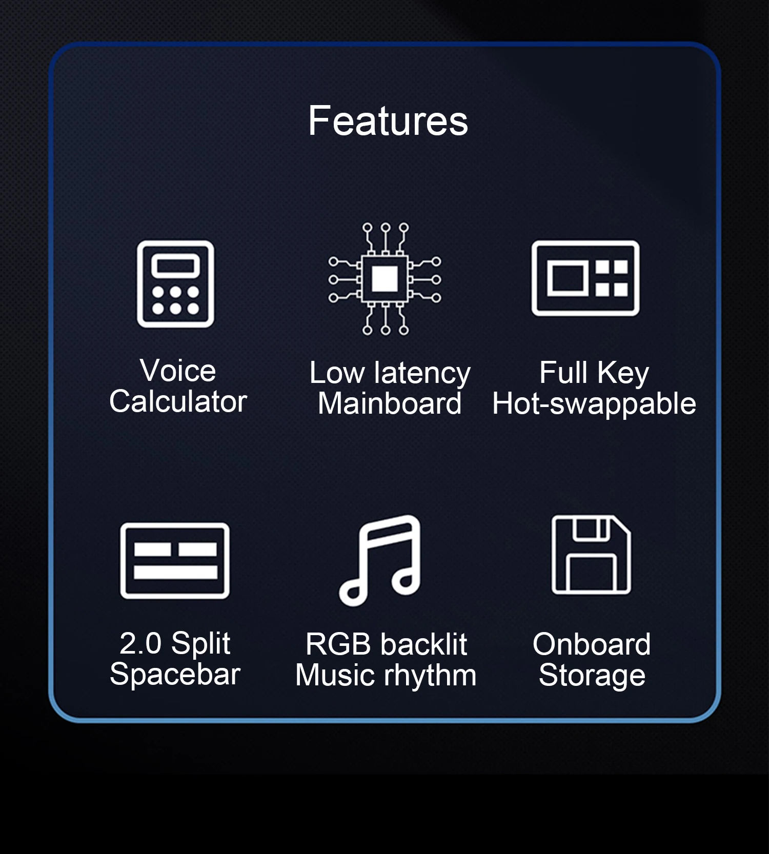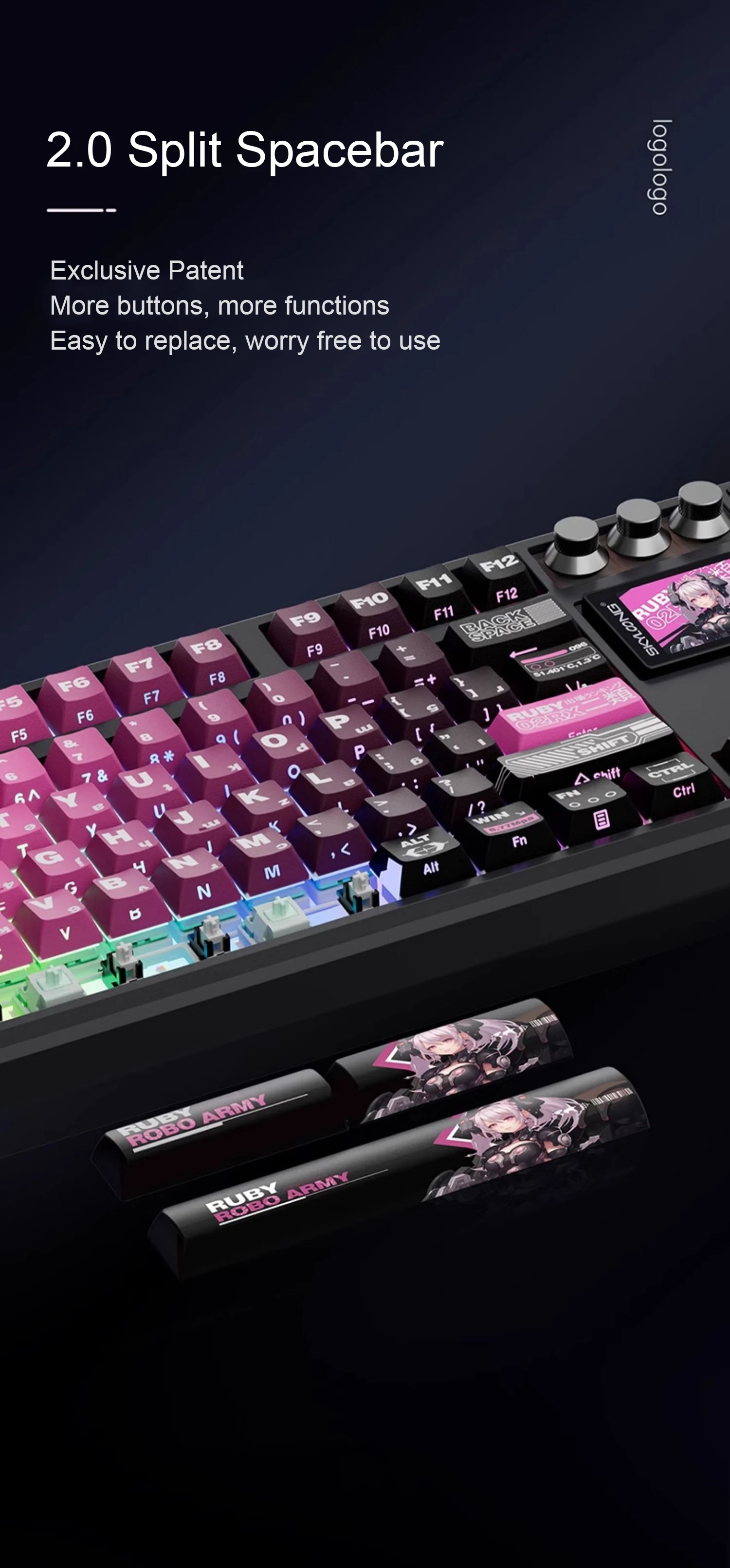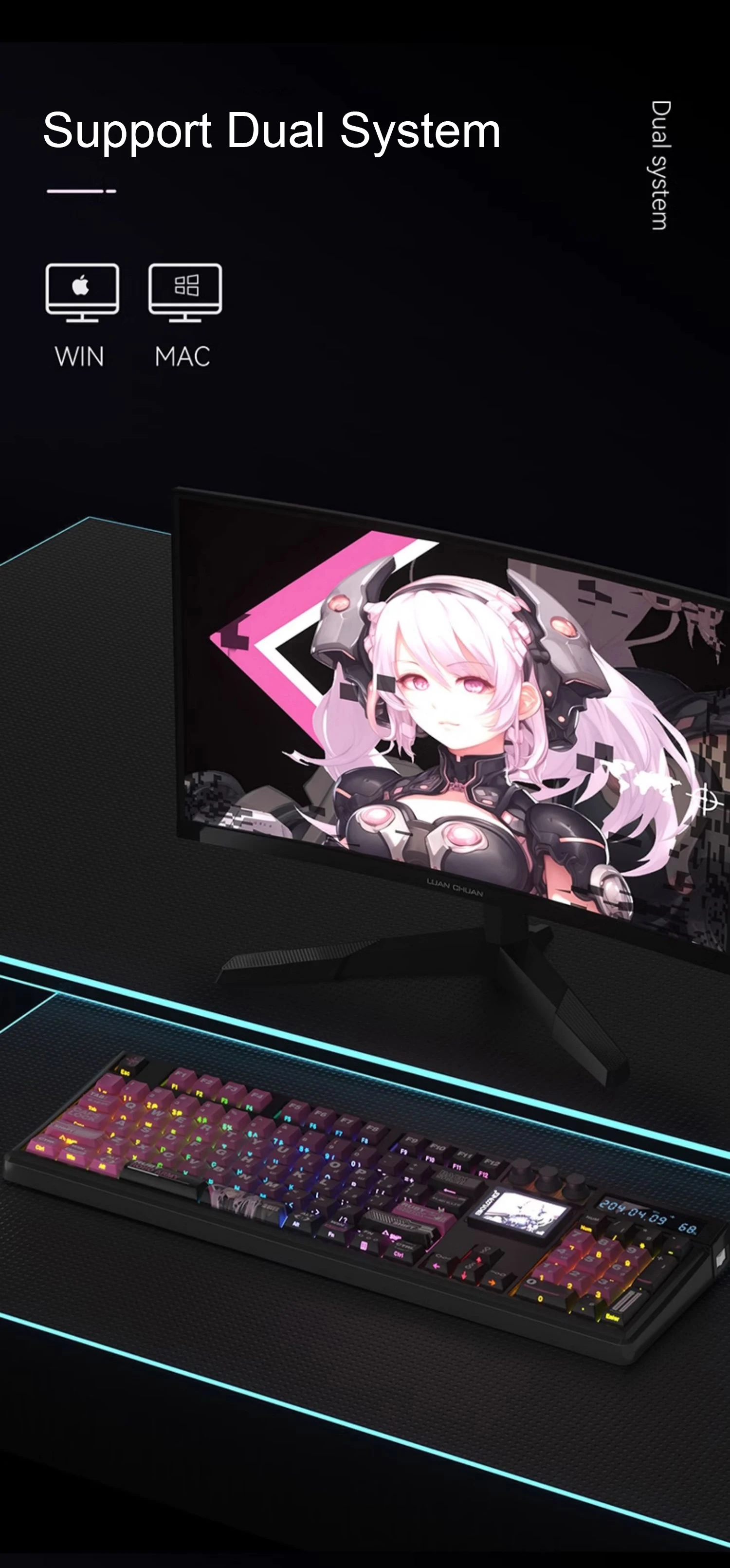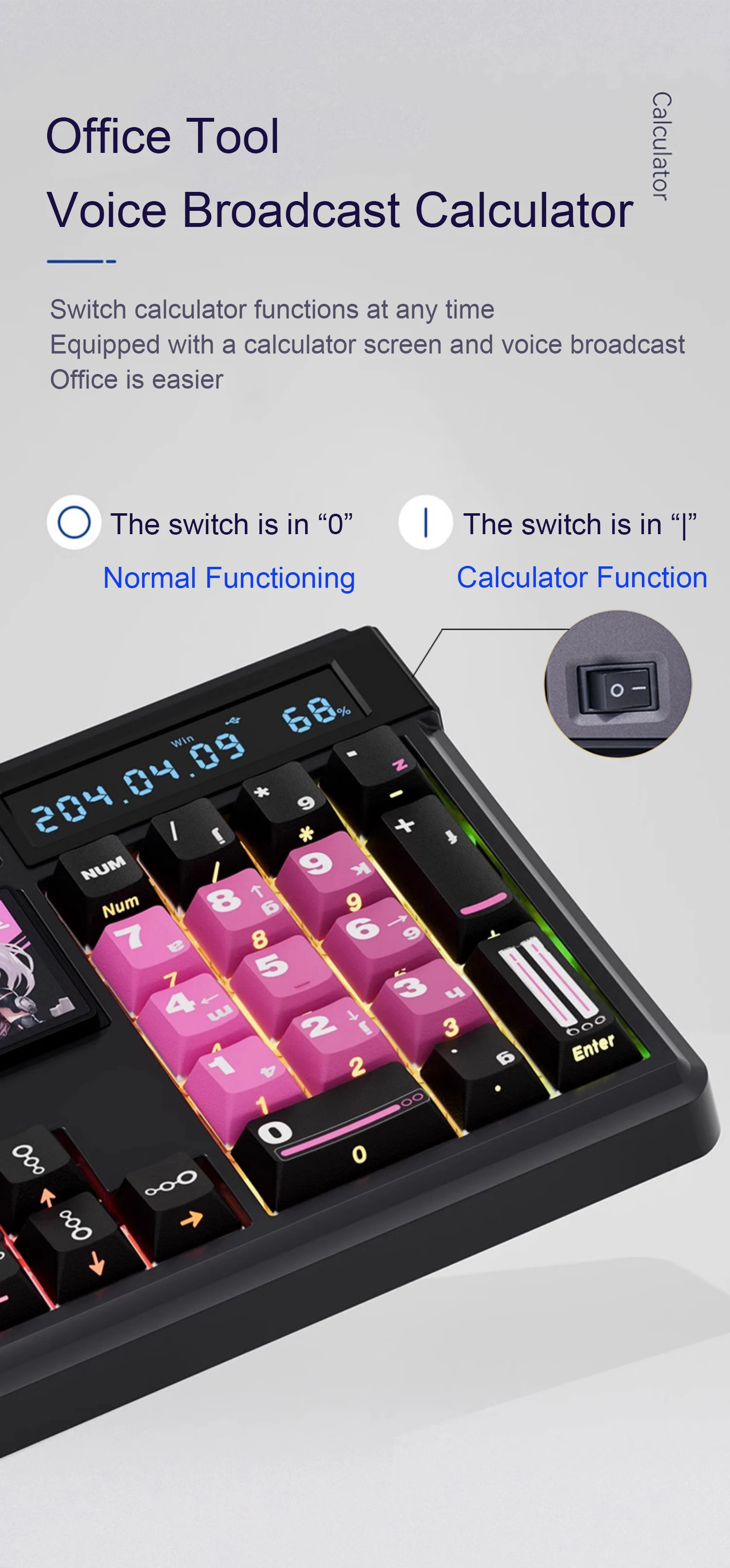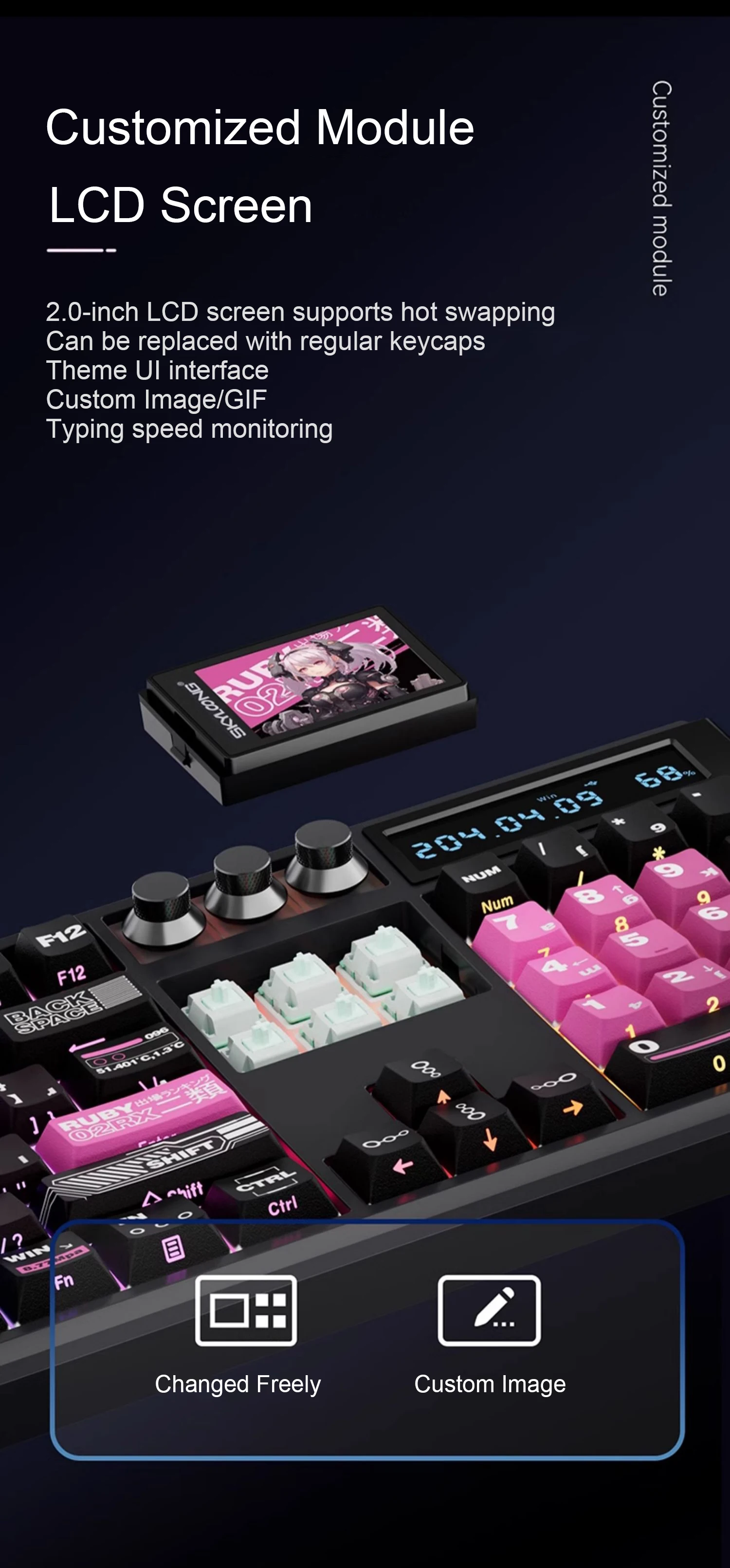 GK104 Pro tiene una pantalla digital fija en la esquina superior derecha, que no admite reemplazo.Muestra la fecha, el estado del enlace del teclado y la energía de la batería.Además, tiene la función de calculadora, que puede realizar suma, resta, multiplicación y división.Se puede encender o apagar a través del interruptor en el lado derecho del teclado, y el sonido del teclado se puede activar/desactivar a través de FN+Número 0.Equipado con un 2.Pantalla LCD de 0 pulgadas con una resolución de 320x240, admite intercambio en caliente, controlador independiente, admite importación de animaciones/imágenes ( 15M), admite visualización de fecha, hora, alimentación, estado de conexión, etc.y agrega una función de prueba de velocidad de escritura, se puede reemplazar con teclas e interruptores.