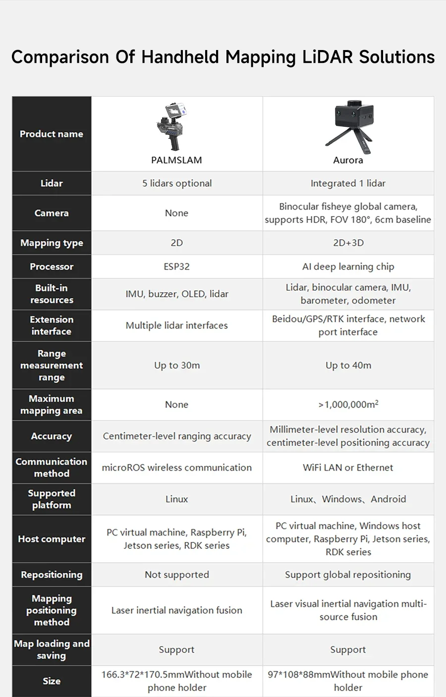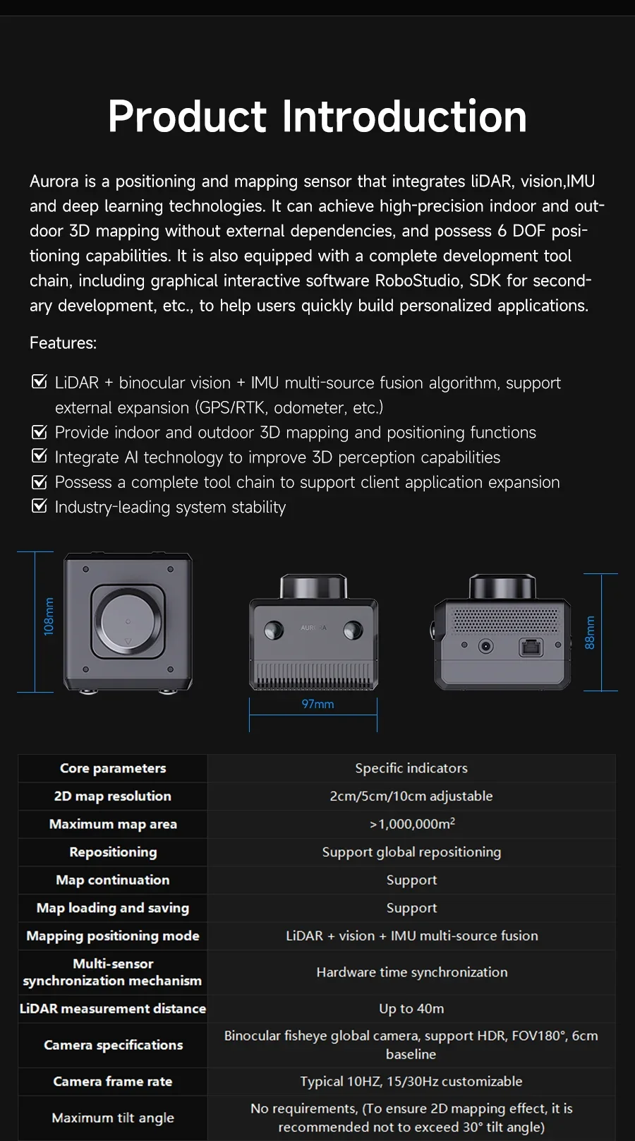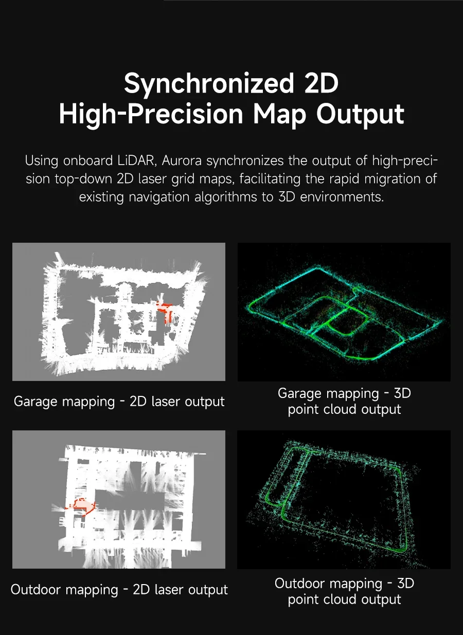 Aurora es un sensor integrado de posicionamiento y mapeo que integra LiDAR, visión binocular, navegación inercial (IMU) y tecnología de aprendizaje profundo de IA, con capacidades de percepción 3D altamente integradas.Aurora puede lograr un mapeo 3D interior y exterior de alta precisión tan pronto como se enciende, sin dependencias externas, admite posicionamiento de 6 DOF y es adecuado para una variedad de escenarios, como el mapeo de edificios de varios pisos y el mapeo de espacios a gran escala..Proporcionamos materiales tutoriales detallados, incluidos software interactivo gráfico RoboStudio y SDK para el desarrollo secundario, que pueden ayudar a los usuarios a expandir diferentes proyectos de aplicaciones.