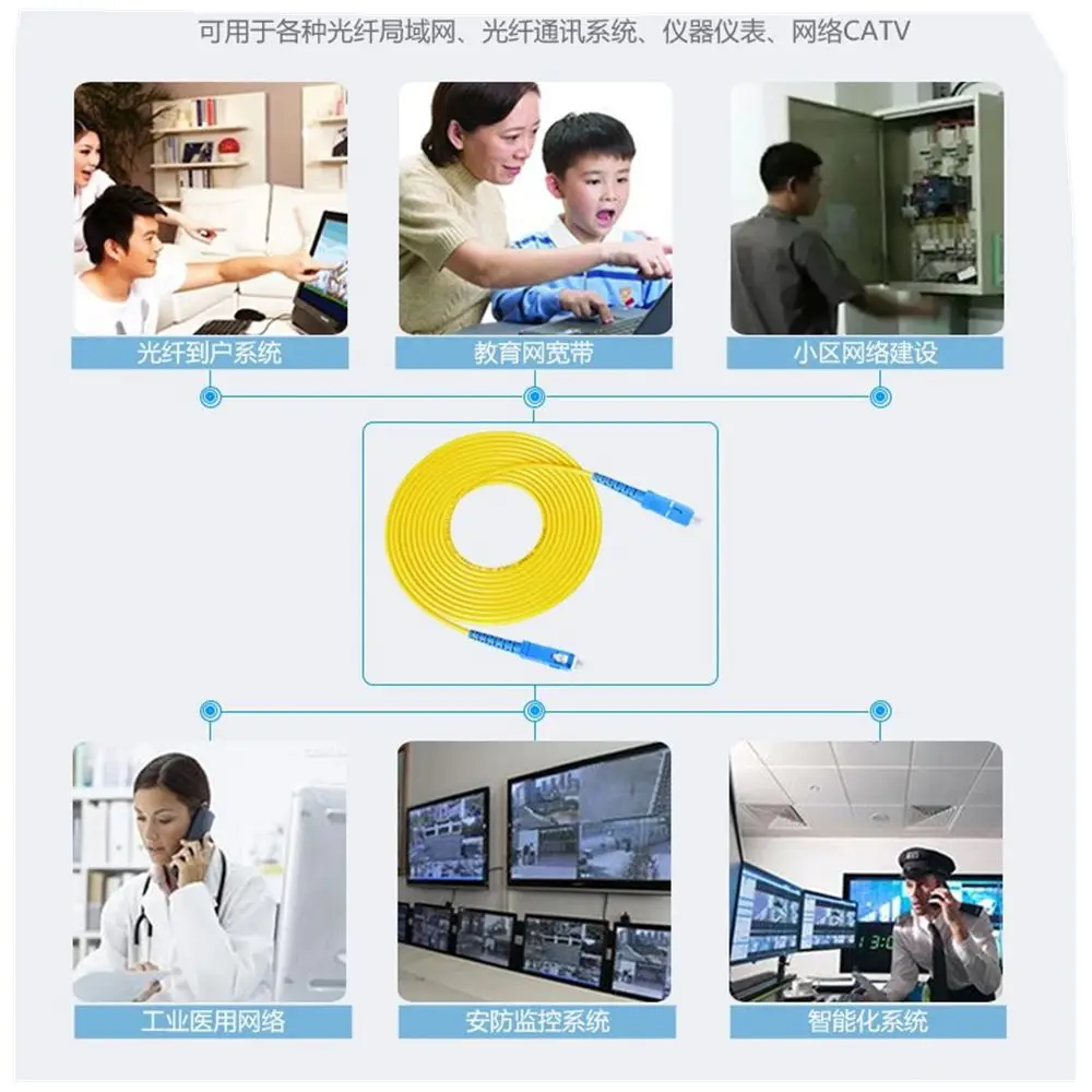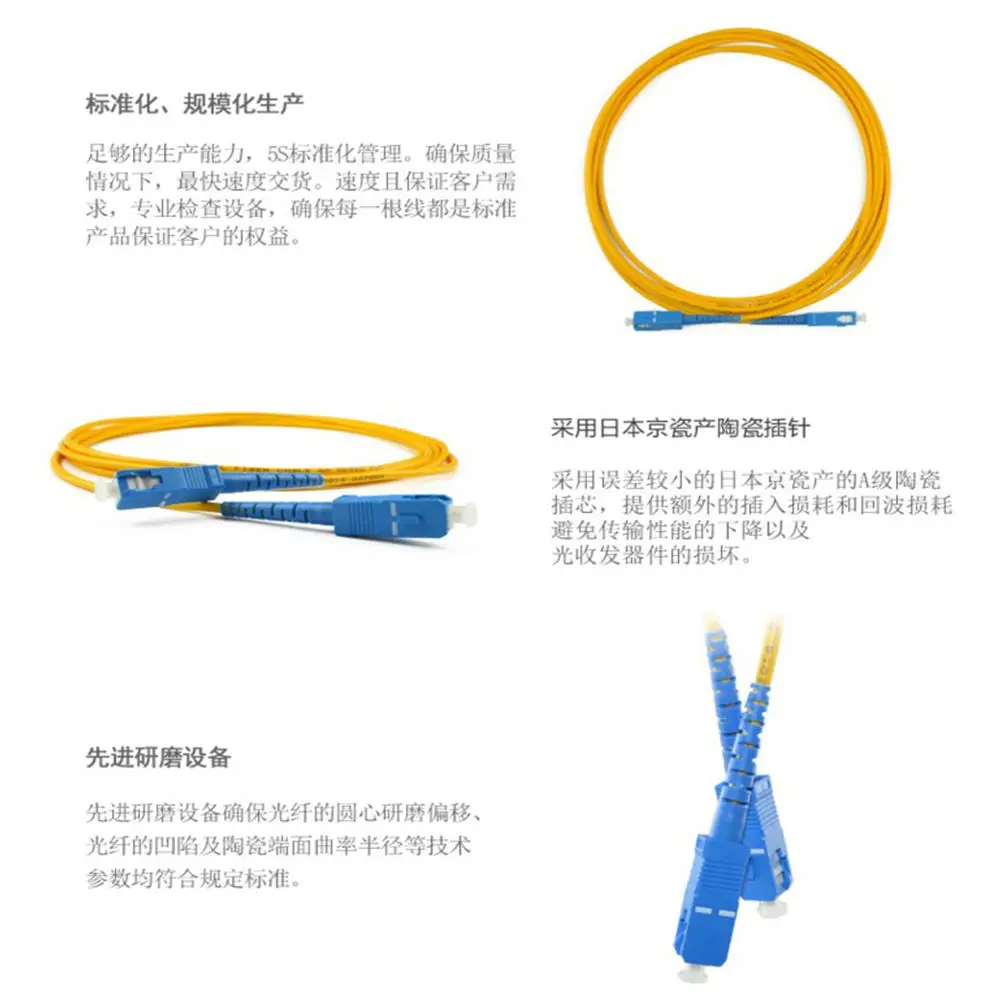 El cable de fibra óptica SC está disponible en versiones monomodo y multimodo, y es totalmente intercambiable con productos NTT-SC.Tanto las versiones monomodo como multimodo El parche de fibra SC vienen con una férula de cerámica de circonio con perfil UPC prepulido y extremo esférico convexo.Estos tipos de cara final permiten un pulido más rápido y una pérdida óptica y reflexión baja del respaldo, al tiempo que garantizan la máxima repetibilidad.