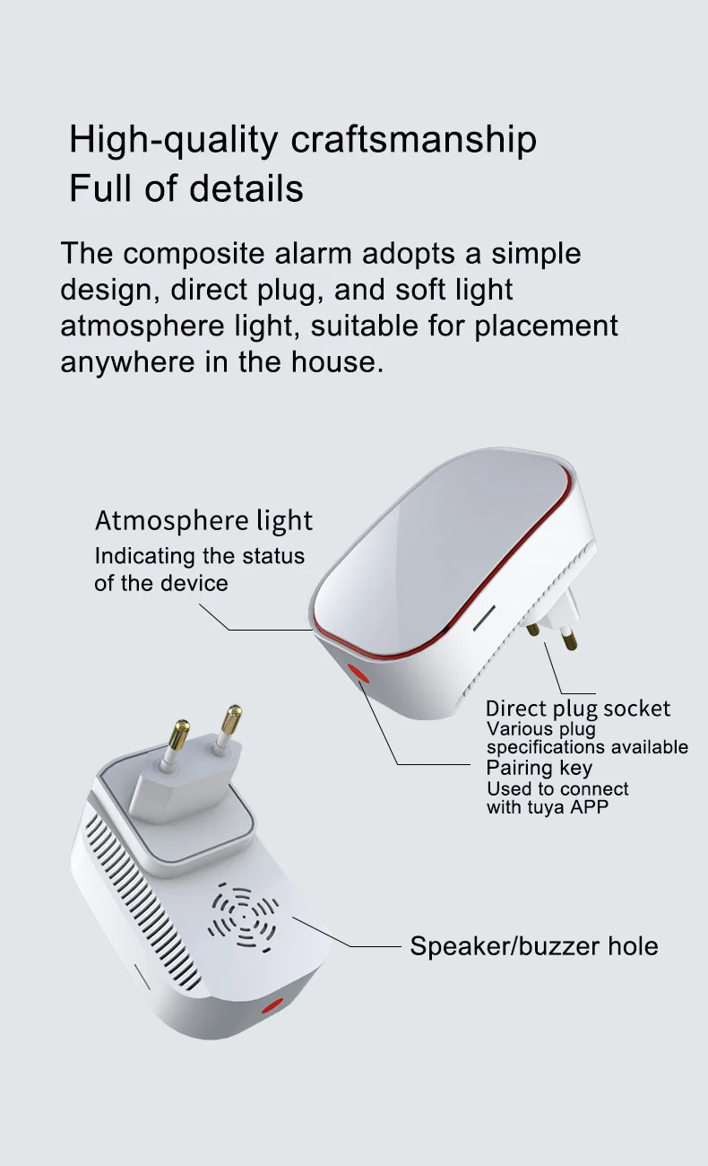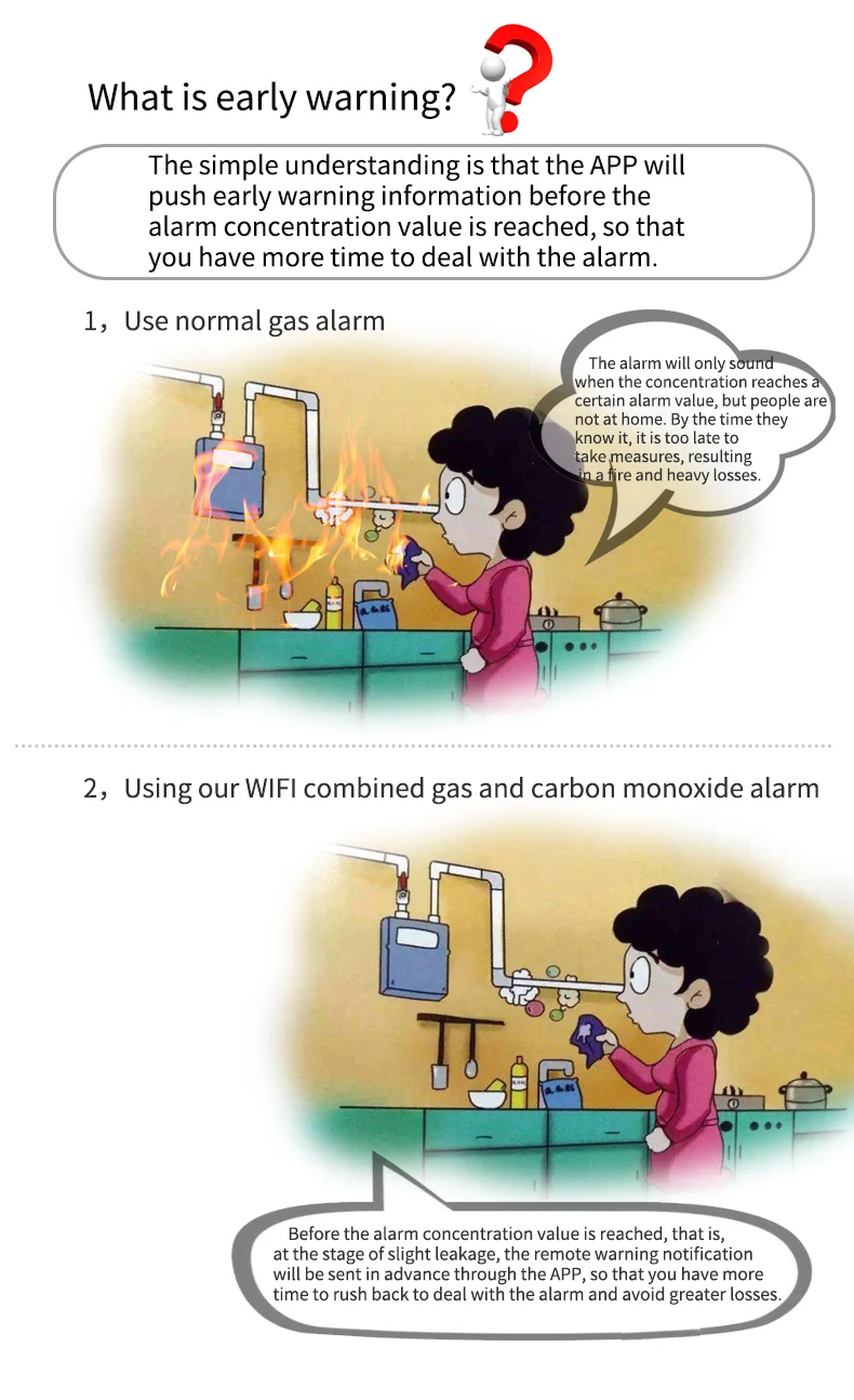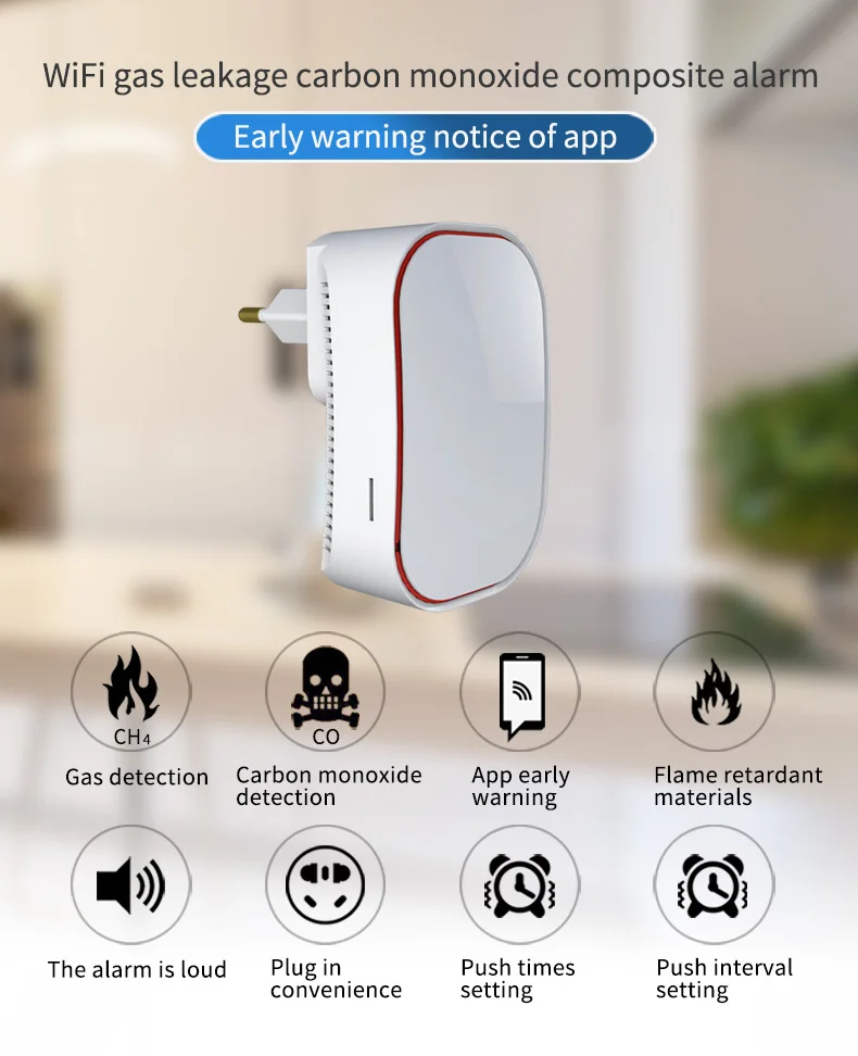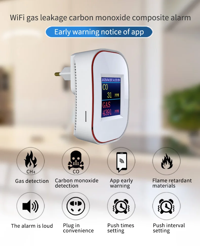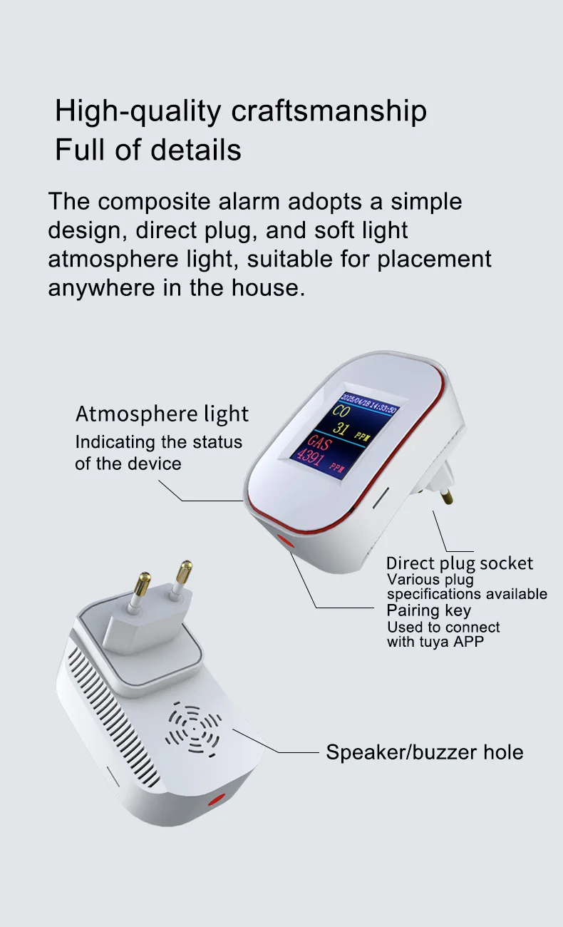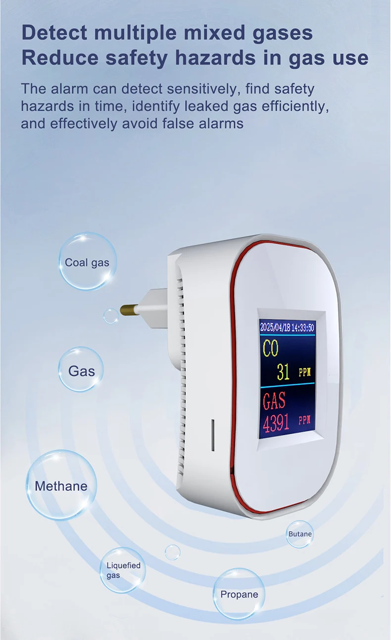 Este producto es una alarma inteligente WIFI, que es una alarma compuesta por un sensor de gas de combustión catalítica (C3H8, CH4, GLP) y un sensor electroquímico de monóxido de carbono (CO).Se puede utilizar para detectar la concentración y fugas de diversos gases combustibles como gas natural, gas GLP, gas de carbón, metano, propano y monóxido de carbono.