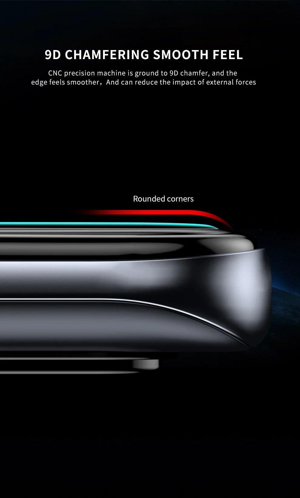 El vidrio templado de borde curvo especialmente diseñado cubre el área plana y curva para proteger contra grietas.