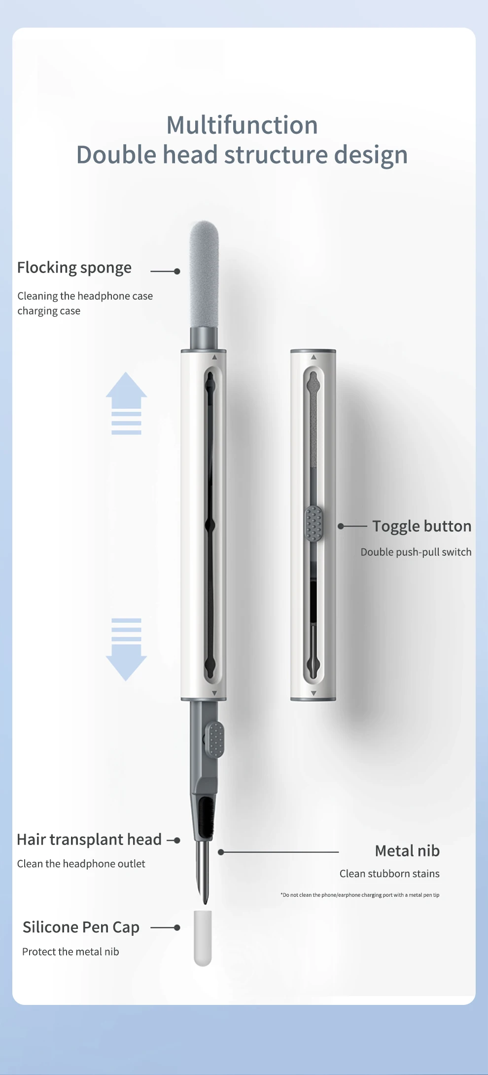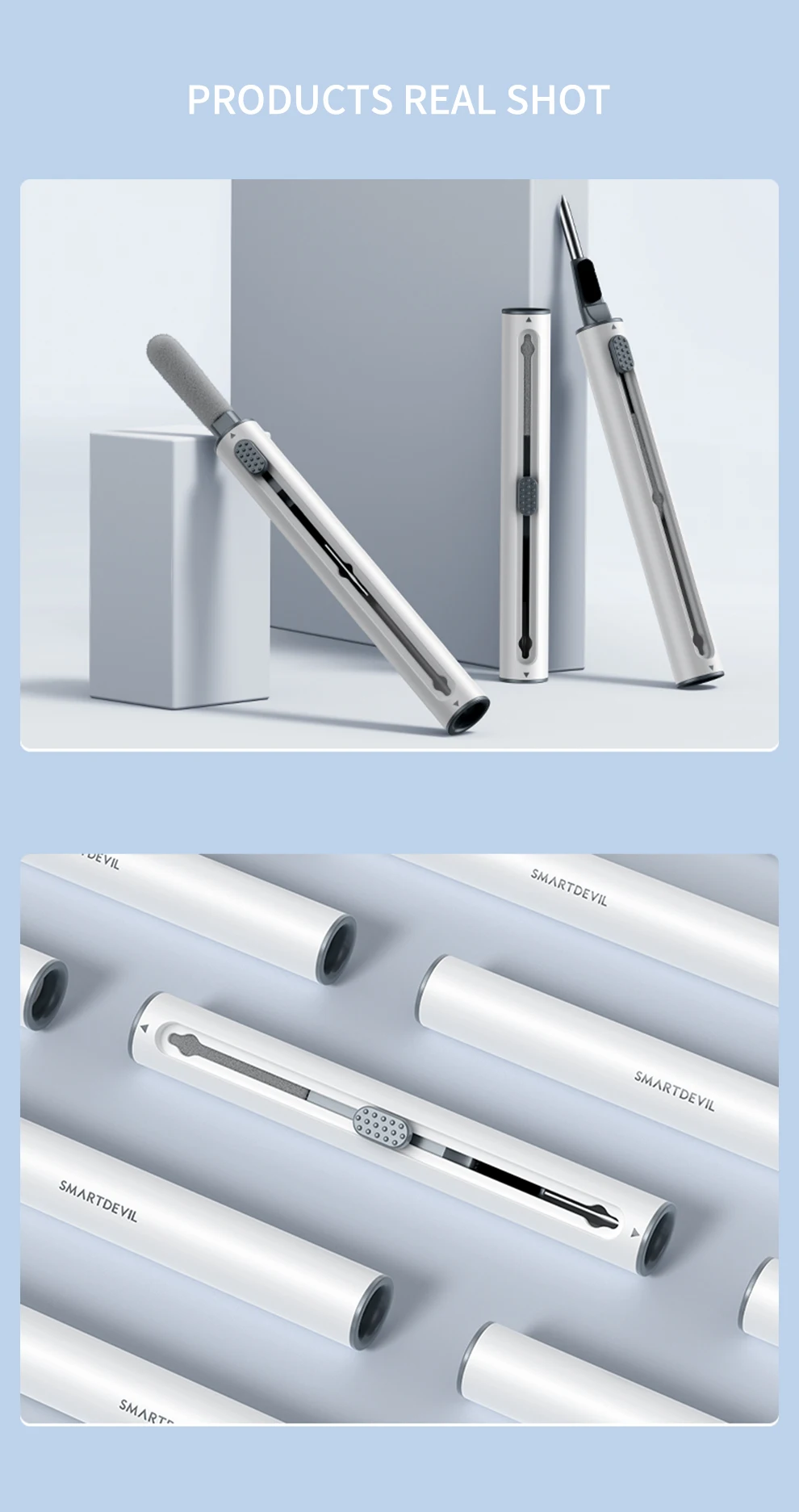 Diseño de doble cabezal separado:Kit de limpieza de auriculares SmartDevil3-in-1 con esponja flocada, cepillo de alta densidad y Punta de bolígrafo de Metal, diseño oculto de doble cabezal para satisfacer una variedad de necesidades de limpieza