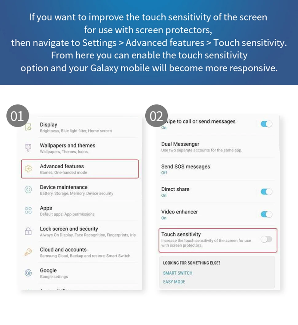 Si deseas mejorar la sensibilidad táctil de la pantalla para usarla con protectores de pantalla, accede a Configuración> Características avanzadas> sensibilidad táctil. Desde aquí puedes activar la opción de sensibilidad táctil y tu Galaxy mobile será más sensible.