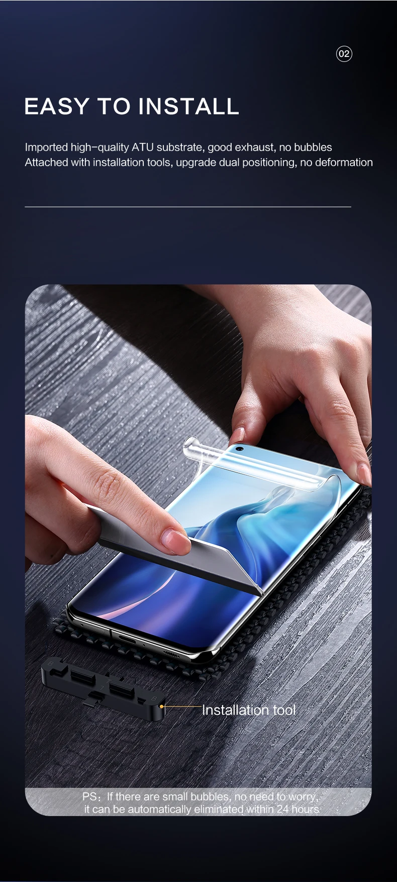 Finalmente, limpie los bordes circundantes con No. 2 toallitas húmedas para que la película se ajuste completamente a la pantalla y luego retire la capa de protección de la superficie. (Si quedan burbujas de aire, se eliminarán automáticamente en 48 horas)