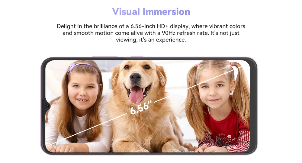 Deléitese con el brillo de una pantalla HD+ de 6,56 pulgadas, donde los colores vibrantes y el movimiento suave cobran vida con una frecuencia de actualización de 90 Hz.No es sólo ver; es una experiencia.