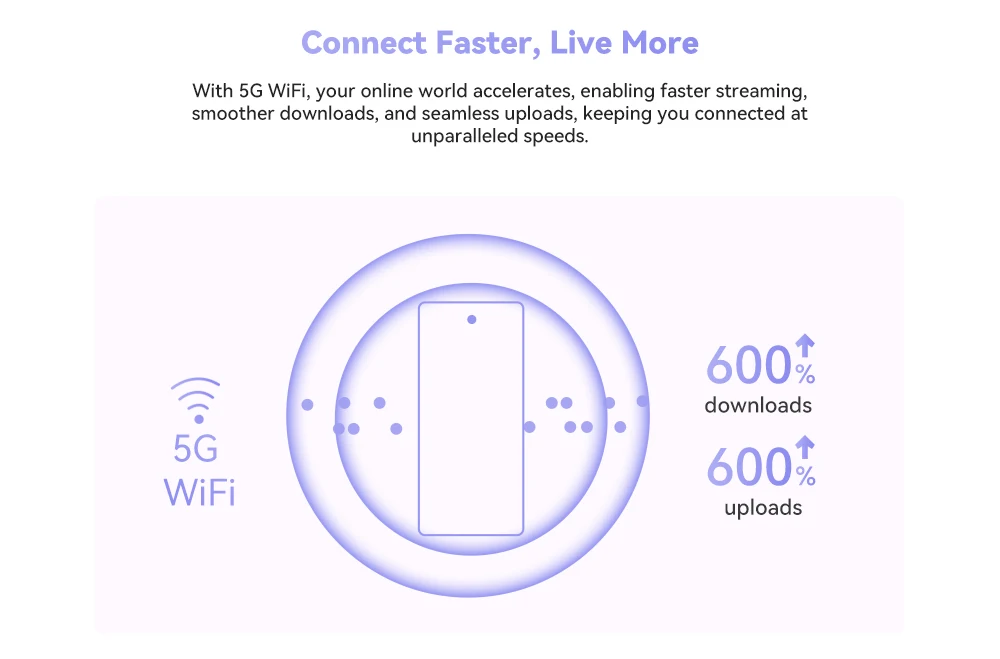 Con WiFi 5G, su mundo en línea acelera, lo que permite una transmisión más rápida, descargas más fluidas y cargas fluidas, manteniéndolo conectado a velocidades incomparables.