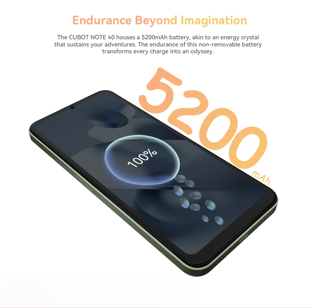The CUBOT NOTE 40 houses a 5200mAh battery, akin to an energy crystal that sustains your adventures. The endurance of this non-removable battery transforms every charge into an odyssey.