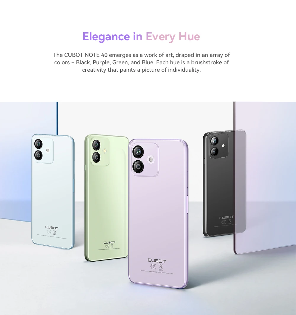 The CUBOT NOTE 40 emerges as a work of art, draped in an array of colors –Black, Purple, Green, and Blue. Each hue is a brushstroke of creativity that paints a picture of individuality.