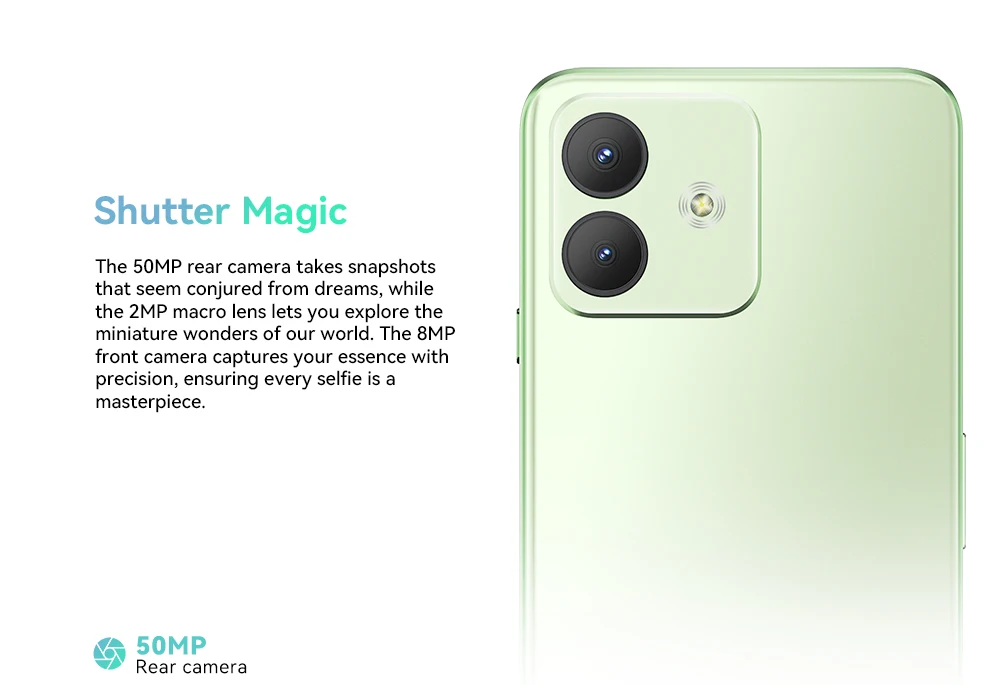 The 50MP rear camera takes snapshots that seem conjured from dreams, while the 2MP macro lens lets you explore the miniature wonders of our world. The 8MP front camera captures your essence with precision, ensuring every selfie is a masterpiece.