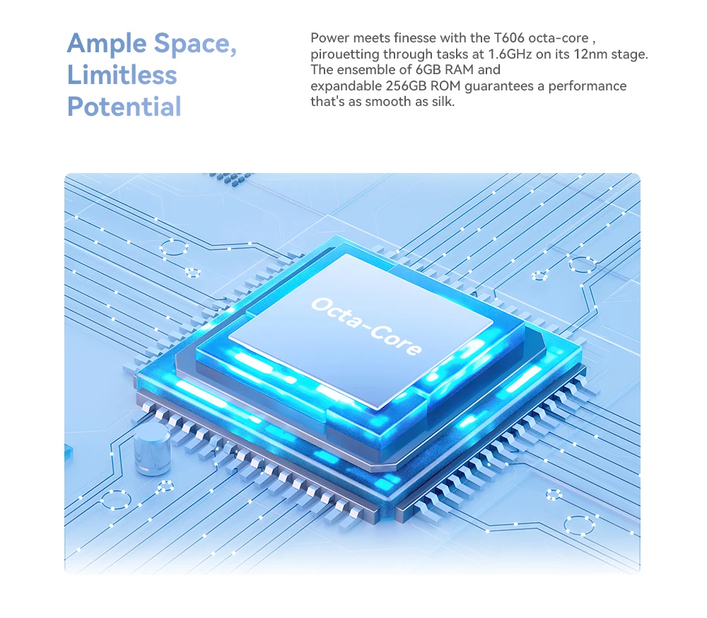 Power meets finesse with the T606 octa-core, pirouetting through tasks at 1.6GHz on its 12nm stage. The ensemble of 6GB RAM and expandable 256GB ROM guarantees a performance that's as smooth as silk.