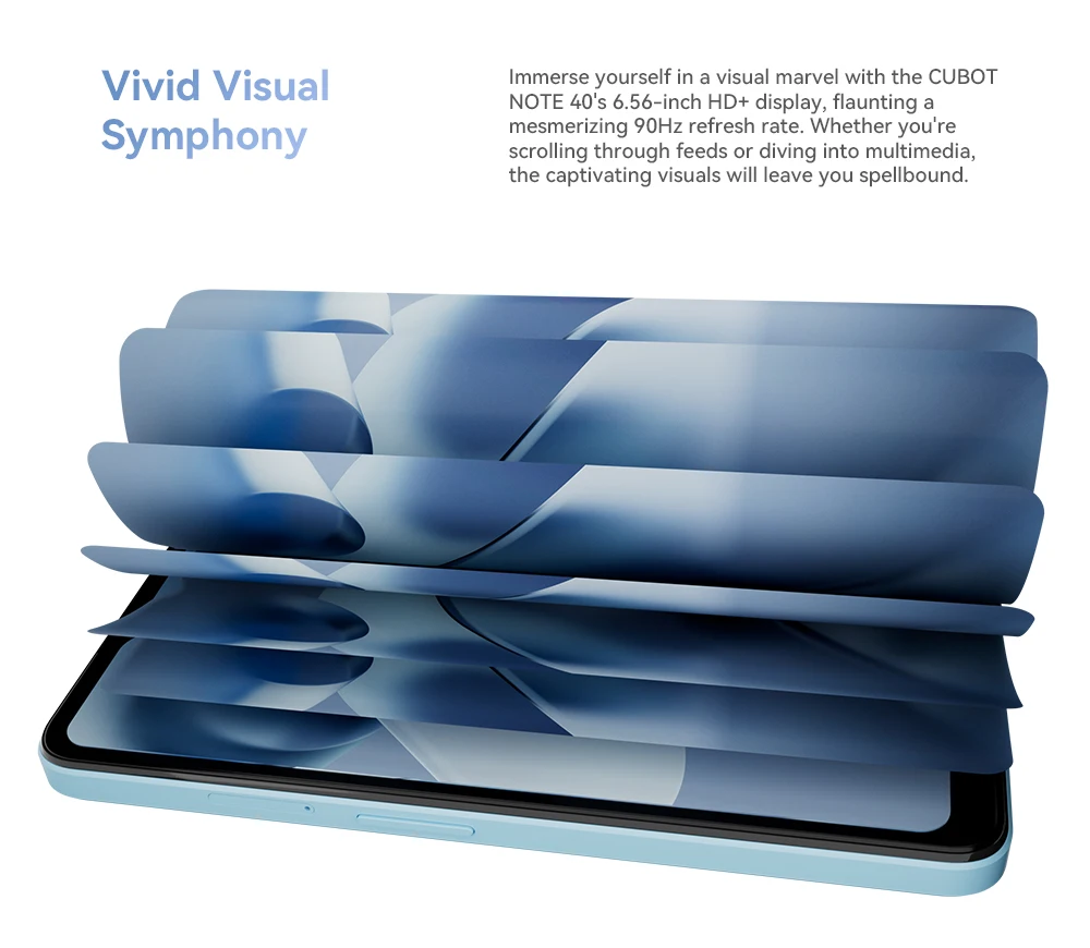 Immerse yourself in a visual marvel with the CUBOT NOTE 40's 6.56-inch HD+ display, flaunting a mesmerizing 90Hz refresh rate. Whether you're scrolling through feeds or diving into multimedia, the captivating visuals will leave you spellbound.