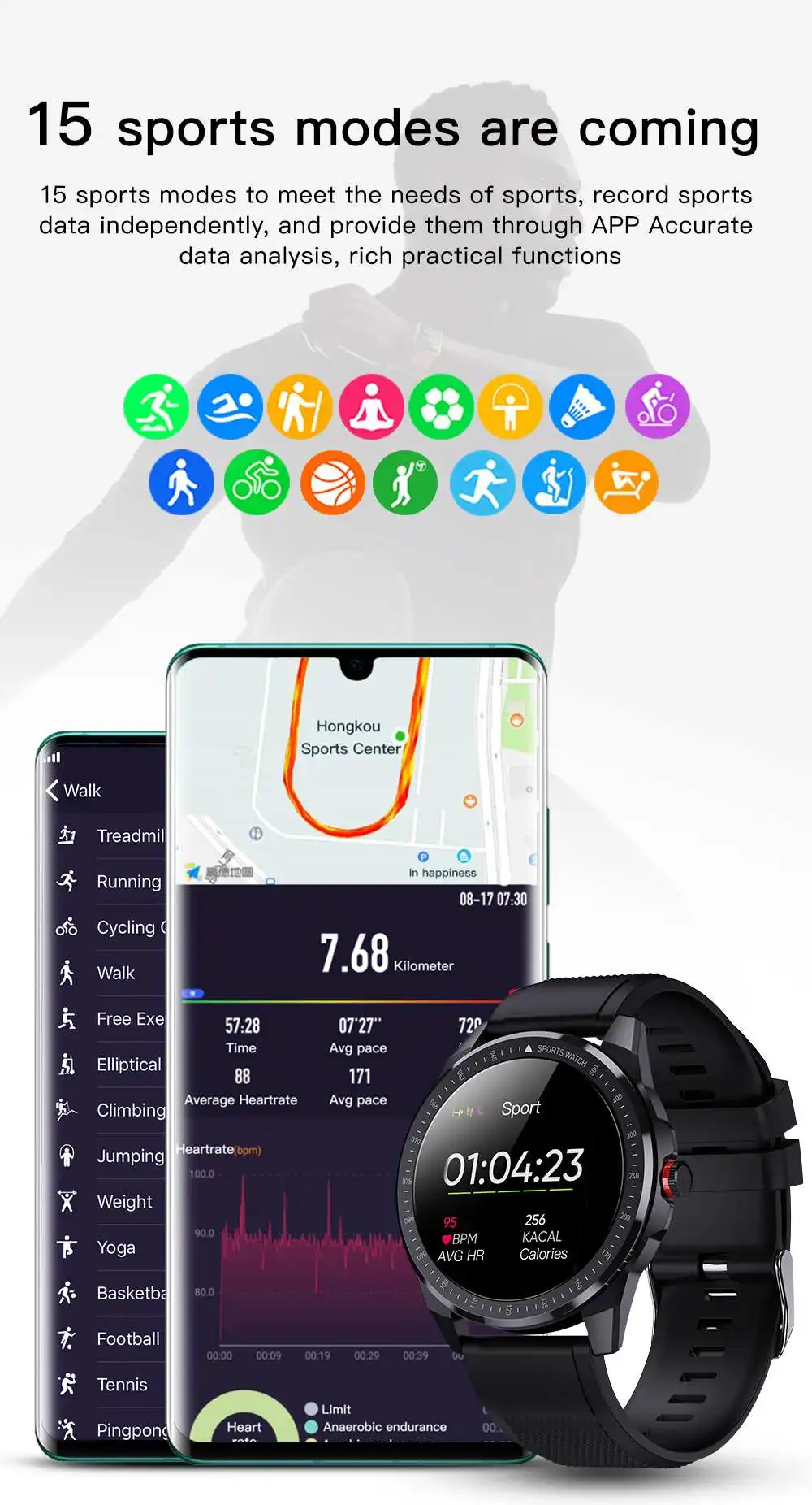 -15 tipos de modelos de sprot: correr en interiores, correr al aire libre, ciclismo al aire libre, caminar, entrenamiento libre, máquina elíptica, montañismo, saltar la cuerda, levantamiento de pesas, yoga, baloncesto, fútbol, tenis, bádminton y tenis de mesa.
