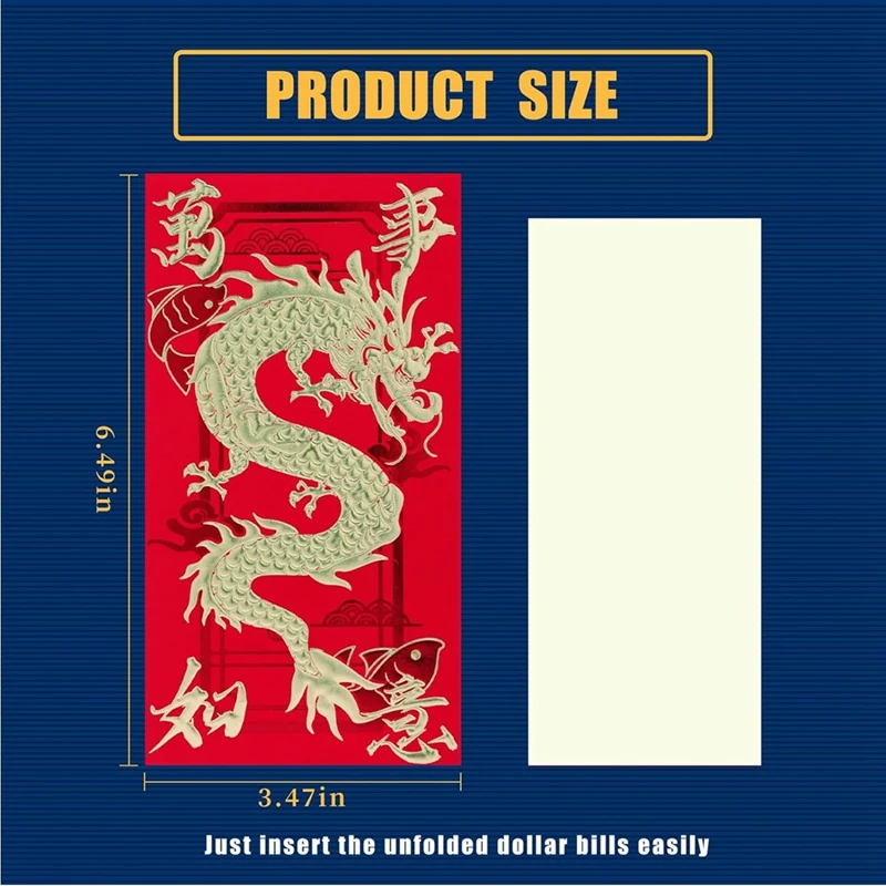 El paquete contiene: 18 sobres rojos del Año del dragón, 6 patrones, 3 para cada uno en el tamaño de 17x9cm/6,69x3,54 pulgadas, perfectos para los billetes de un dólar, no es necesario doblar